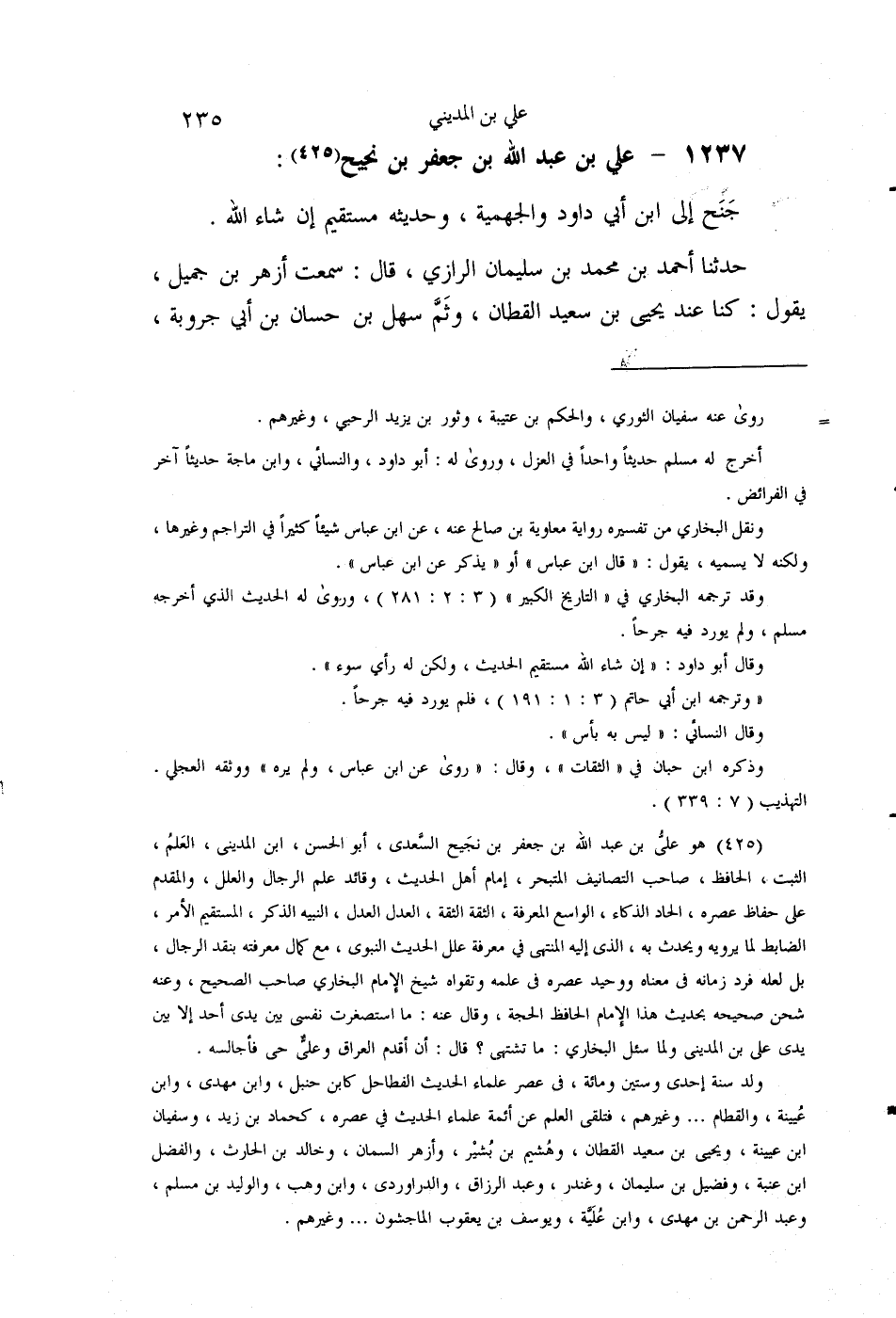 §1237 - عَلِيُّ بْنُ عَبْدِ اللَّهِ بْنِ جَعْفَرِ بْنِ نَجِيحٍ جَنَحَ إِلَى ابْنِ أَبِي دَاوُدٍ وَالْجَهْمِيَّةِ، وَحَدِيثُهُ مُسْتَقِيمٌ إِنْ شَاءَ اللَّهُ. حَدَّثَنَا أَحْمَدُ بْنُ مُحَمَّدِ بْنِ سُلَيْمَانَ الرَّازِيُّ قَالَ: سَمِعْتُ أَزْهَرَ بْنَ جَمِيلٍ يَقُولُ: " كُنَّا عِنْدَ يَحْيَى بْنِ سَعِيدٍ الْقَطَّانِ وَثَمَّ سَهْلُ بْنُ حَسَّانَ بْنِ أَبِي جَرُوبَةَ -[239]- وَابْنُ الْمَدِينِيِّ وَالشَّاذَكُونِيُّ وَسُلَيْمَانُ صَاحِبُ الْبَصْرِيِّ وَالْقَوَارِيرِيُّ وَسُفْيَانُ الرَّاسُّ فَجَاءَ عَبْدُ الرَّحْمَنِ بْنُ مَهْدِيٍّ فَسَلَّمَ عَلَى أَبِي سَعِيدٍ وَجَلَسَ إِلَيْهِ فَقَالَ لَهُ يَحْيَى: مَالِي أَرَاكَ خَائِرَ النَّفْسِ؟ قَالَ: رَأَيْتُ الْبَارِحَةَ رُؤْيَا هَالَتْنِي، فَقَالَ: لَا يَكُونُ إِلَّا خَيْرًا إِنْ شَاءَ اللَّهُ، فَقَالَ لَهُ عَلِيُّ بْنُ الْمَدِينِيِّ: أَيُّ شَيْءٍ رَأَيْتَ يَا أَبَا سَعِيدٍ؟ قَالَ: رَأَيْتُ قَوْمًا مِنْ أَصْحَابِنَا أُرْكِسُوا، قَالَ: فَقَالَ عَلِيٌّ: أَضْغَاثُ أَحْلَامٍ، فَقَالَ لَهُ عَبْدُ الرَّحْمَنِ: اسْكُتْ فَوَاللَّهِ يَا عَلِيُّ إِنَّكَ مِنْهُمْ، فَقَالَ عَلِيٌّ: إِنَّ اللَّهَ يَقُولُ: {وَمَنْ نُعَمِّرْهُ نُنَكِّسْهُ فِي الْخَلْقِ} [يس: 68] فَقَالَ: لَيْسَ هُوَ وَاللَّهِ بِذَاكَ. وَقَرَأْتُ عَلَى عَبْدِ اللَّهِ بْنِ أَحْمَدَ كِتَابَ الْعِلَلِ عَنْ أَبِيهِ، فَرَأَيْتُ فِيهِ حَكَايَاتٍ كَثِيرَةً عَنْ أَبِيهِ عَنْ عَلِيِّ بْنِ عَبْدِ اللَّهِ، ثُمَّ قَدْ ضَرَبَ عَلَى اسْمِهِ وَكَتَبَ فَوْقَهُ: حَدَّثَنَا رَجُلٌ، ثُمَّ ضَرَبَ عَلَى الْحَدِيثِ كُلِّهِ، فَسَأَلْتُ عَبْدَ اللَّهِ فَقَالَ: كَانَ أَبِي حَدَّثَنَا عَنْهُ ثُمَّ أَمْسَكَ عَنِ اسْمِهِ، وَكَانَ يَقُولُ: حَدَّثَنَا رَجُلٌ، ثُمَّ تَرَكَ حَدِيثَهُ بَعْدَ ذَاكَ