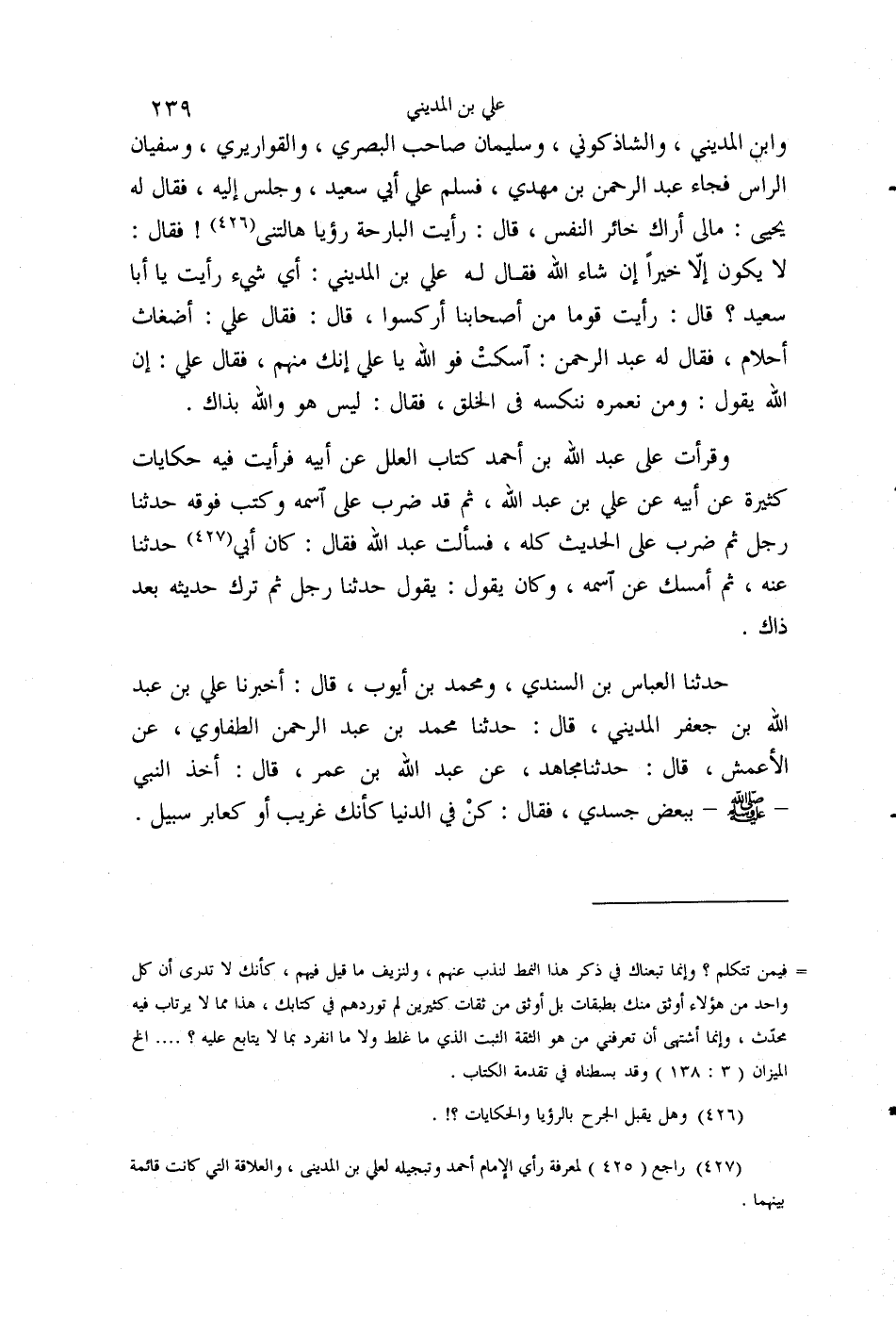 حَدَّثَنَا الْعَبَّاسُ بْنُ السِّنْدِيِّ، وَمُحَمَّدُ بْنُ أَيُّوبَ قَالَ: أَخْبَرَنَا عَلِيُّ بْنُ عَبْدِ اللَّهِ بْنِ جَعْفَرٍ الْمَدِينِيِّ قَالَ: حَدَّثَنَا مُحَمَّدُ بْنُ عَبْدِ الرَّحْمَنِ الطُّفَاوِيُّ، عَنِ الْأَعْمَشِ قَالَ: حَدَّثَنَا مُجَاهِدٌ، عَنْ عَبْدِ اللَّهِ بْنِ عُمَرَ قَالَ: " أَخَذَ النَّبِيُّ صَلَّى اللهُ عَلَيْهِ وَسَلَّمَ بِبَعْضِ جَسَدِي فَقَالَ: §«كُنْ فِي الدُّنْيَا كَأَنَّكَ غَرِيبٌ أَوْ كَعَابِرِ سَبِيلٍ»