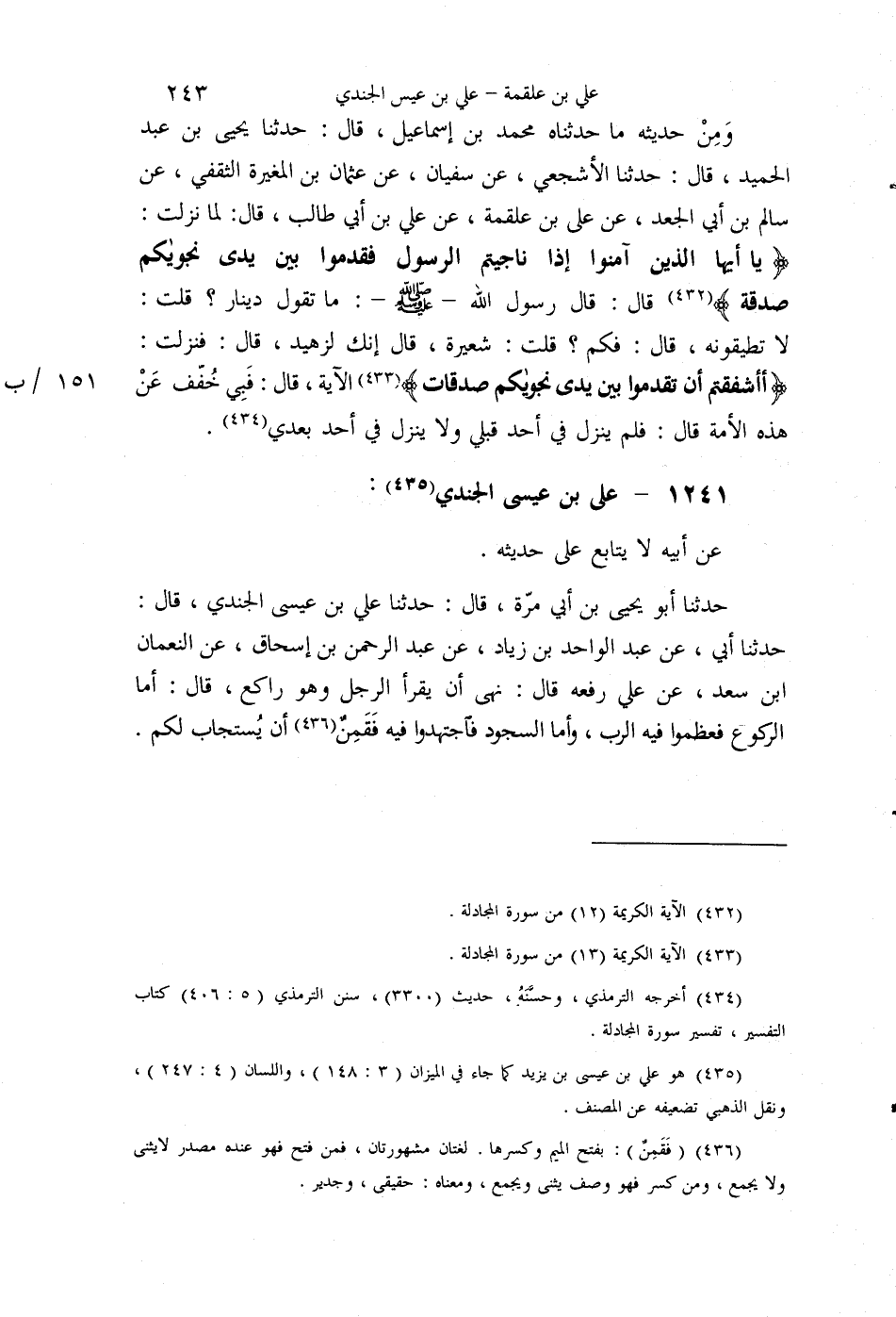 §1241 - عَلِيُّ بْنُ عِيسَى الْجَنَدِيُّ عَنْ أَبِيهِ، لَا يُتَابَعُ عَلَى حَدِيثِهِ
