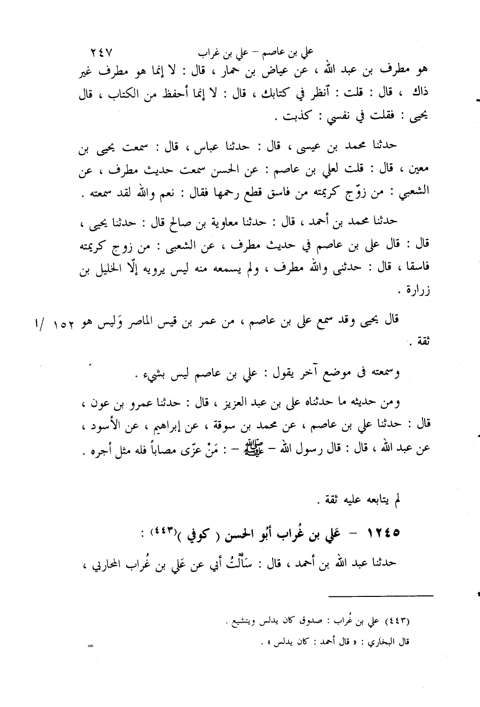§1245 - عَلِيُّ بْنُ غُرَابٍ أَبُو الْحَسَنِ كُوفِيٌّ حَدَّثَنَا عَبْدُ اللَّهِ بْنُ أَحْمَدَ، قَالَ سَأَلْتُ أَبِي عَنْ عَلِيِّ بْنِ غُرَابٍ الْمُحَارِبِيِّ قَالَ: لَيْسَ لِي بِهِ خِبْرَةٌ، سَمِعْتُ مِنْهُ مَجْلِسًا وَاحِدًا كَانَ يُدَلِّسُ، مَا أُرَاهُ إِلَّا كَانَ صَدُوقًا حَدَّثَنِي آدَمُ بْنُ مُوسَى قَالَ: سَمِعْتُ الْبُخَارِيَّ قَالَ: عَلِيُّ بْنُ غُرَابٍ قَالَ أَحْمَدُ: كَانَ يُدَلِّسُ