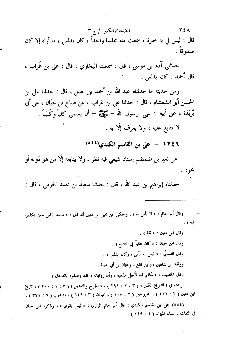 §1246 - عَلِيُّ بْنُ الْقَاسِمِ الْكِنْدِيُّ عَنْ نُعَيْمِ بْنِ ضَمْضَمٍ، إِسْنَادٌ شِيعِيُّ، فِيهِ نَظَرٌ، وَلَا يُتَابِعَهُ إِلَّا مَنْ هُوَ دُونَهُ أَوْ نَحْوَهُ