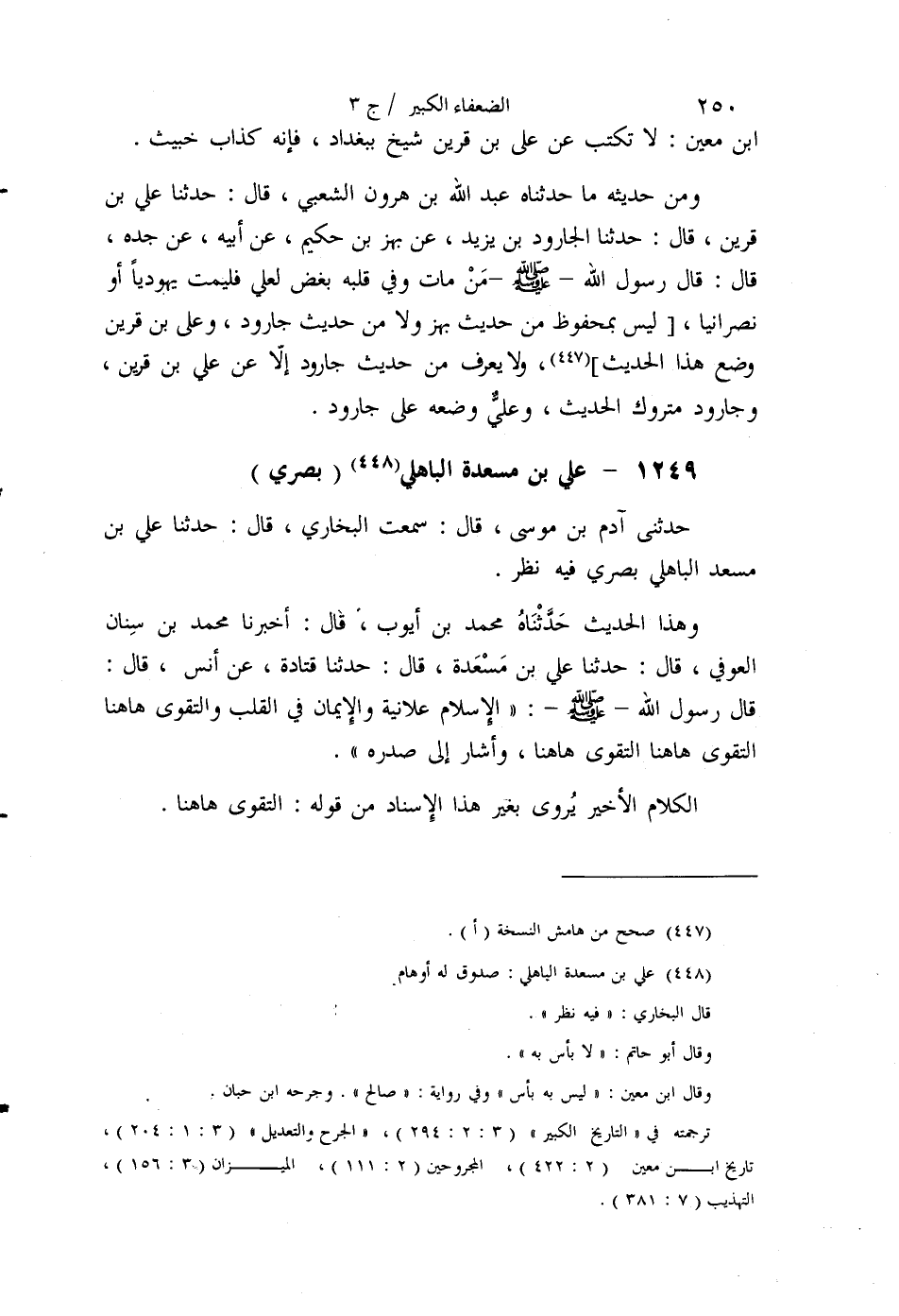 §1249 - عَلِيُّ بْنُ مَسْعَدَةَ الْبَاهِلِيُّ بَصْرِيٌّ حَدَّثَنِي آدَمُ بْنُ مُوسَى قَالَ: سَمِعْتُ الْبُخَارِيَّ قَالَ: عَلِيُّ بْنُ مُسْعَدٍ الْبَاهِلِيُّ، بَصْرِيٌّ فِيهِ نَظَرٌ