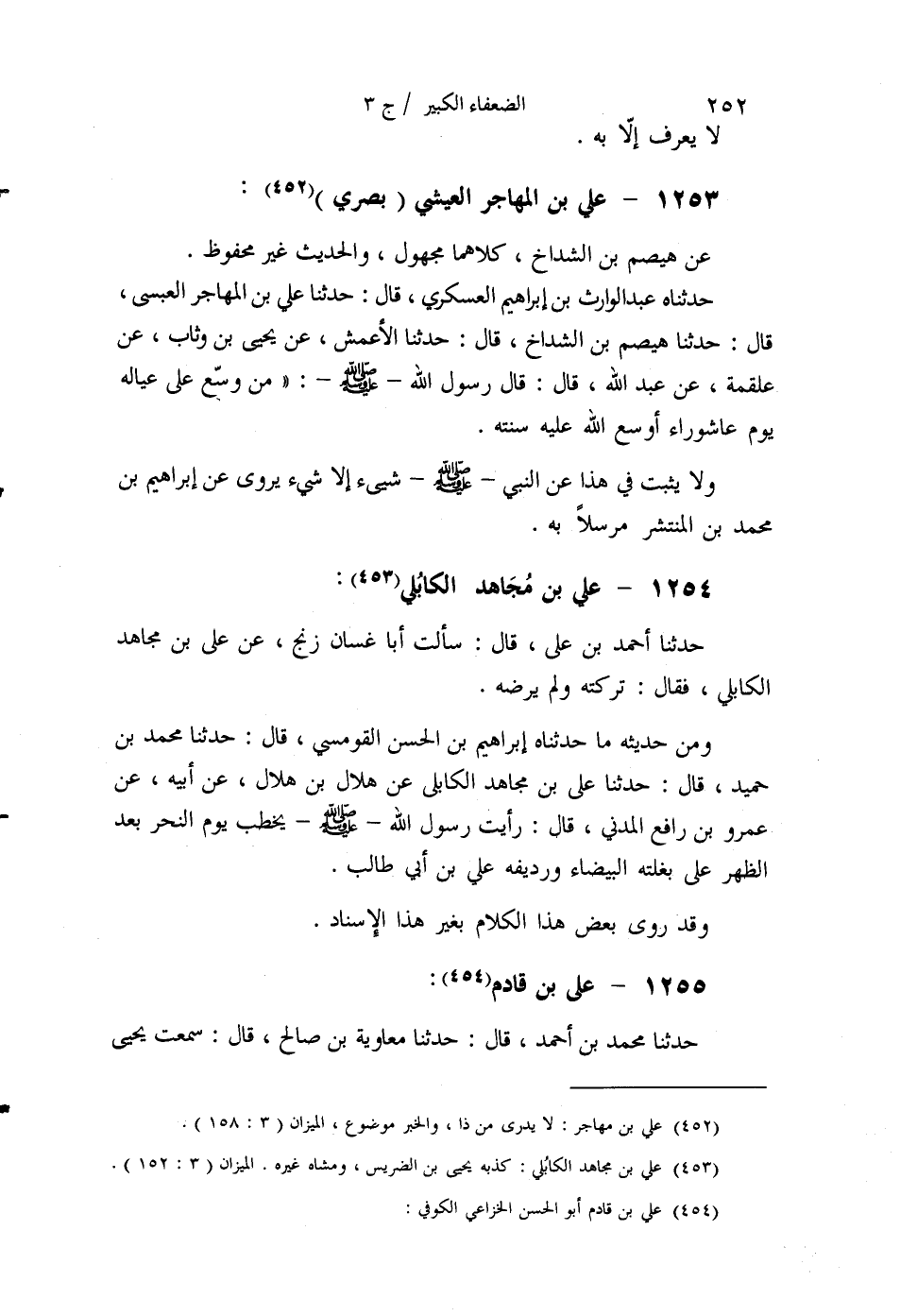 §1253 - عَلِيُّ بْنُ الْمُهَاجِرِ الْعَيْشِيُّ بَصْرِيٌّ عَنْ هَيْصَمِ بْنِ الشَّدَّاخِ، كِلَاهُمَا مَجْهُولٌ، وَالْحَدِيثُ غَيْرُ مَحْفُوظٍ