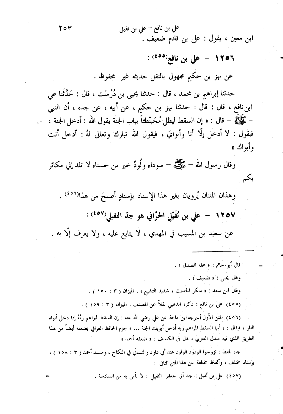§1257 - عَلِيُّ بْنُ نُفَيْلٍ الْحَرَّانِيُّ هُوَ جَدُّ النُّفَيْلِيِّ عَنْ سَعِيدِ بْنِ الْمُسَيِّبِ، فِي الْمَهْدِيِّ، لَا يُتَابَعُ عَلَيْهِ، وَلَا يُعْرَفُ إِلَّا بِهِ