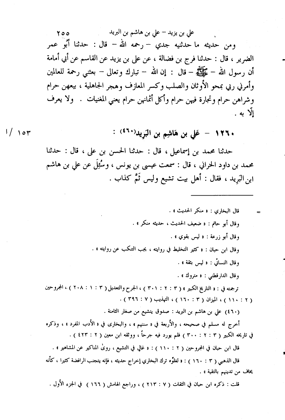 §1260 - عَلِيُّ بْنُ هَاشِمِ بْنِ الْبَرِيدِ حَدَّثَنَا مُحَمَّدُ بْنُ إِسْمَاعِيلَ قَالَ: حَدَّثَنَا الْحَسَنُ بْنُ عَلِيٍّ قَالَ: حَدَّثَنَا مُحَمَّدُ بْنُ دَاوُدَ الْحَرَّانِيُّ قَالَ: سَمِعْتُ عِيسَى بْنَ يُونُسَ، وَسُئِلَ عَنْ عَلِيِّ بْنِ هَاشِمِ بْنِ الْبَرِيدِ، فَقَالَ: أَهْلُ بَيْتِ تَشَيُّعٍ، وَلَيْسَ ثَمَّ كَذَّابٌ