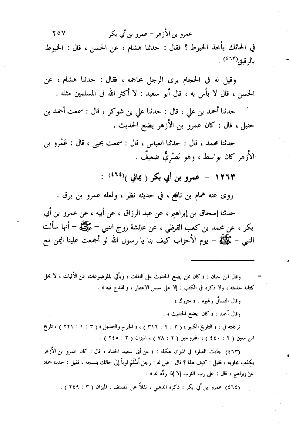 §1263 - عَمْرُو بْنُ أَبِي بَكْرٍ يَمَانِيُّ رَوَى عَنْهُ، هَمَّامُ بْنُ نَافِعٍ، فِي حَدِيثِهِ نَظَرٌ، وَلَعَلَّهُ عَمْرُو بْنُ بَرْقٍ