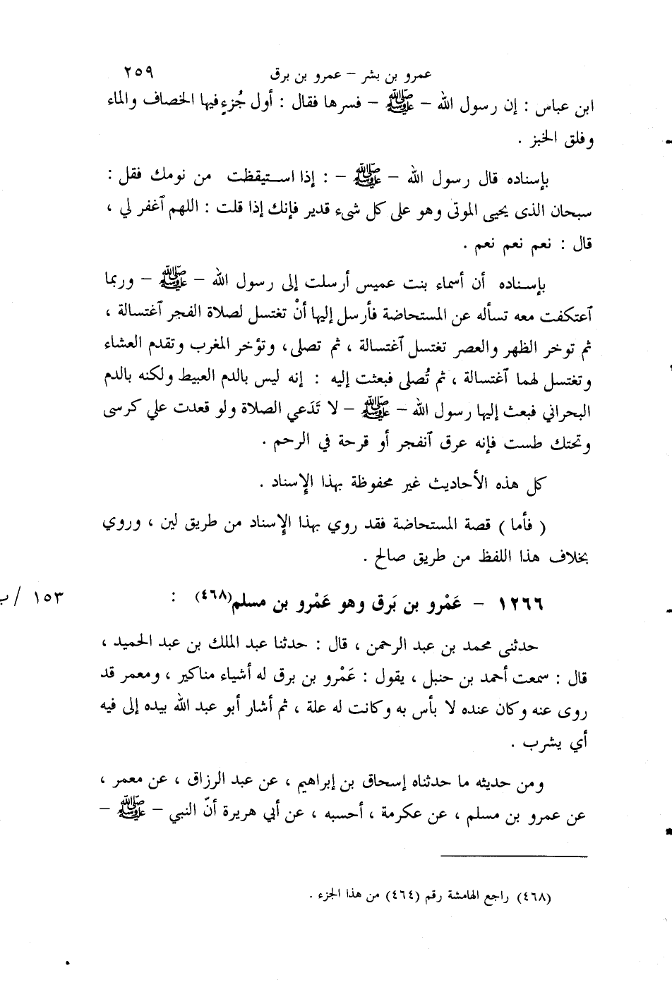 §1266 - عَمْرُو بْنُ بَرْقٍ وَهُوَ عَمْرُو بْنُ مُسْلِمٍ حَدَّثَنِي مُحَمَّدُ بْنُ عَبْدِ الرَّحْمَنِ قَالَ: حَدَّثَنَا عَبْدُ الْمَلِكِ بْنُ عَبْدِ الْحَمِيدِ قَالَ: سَمِعْتُ أَحْمَدَ بْنَ حَنْبَلٍ يَقُولُ: عَمْرُو بْنُ بَرْقٍ لَهُ أَشْيَاءُ مَنَاكِيرُ، وَمَعْمَرٌ قَدْ رَوَى عَنْهُ، وَكَانَ عِنْدَهُ لَا بَأْسَ بِهِ، وَكَانَتْ لَهُ عِلَّةٌ، ثُمَّ أَشَارَ أَبُو عَبْدِ اللَّهِ بِيَدِهِ إِلَى فِيهِ، أَيْ يَشْرَبُ