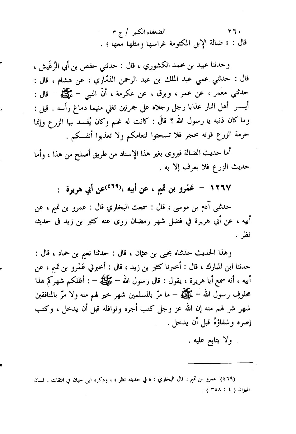 §1267 - عَمْرُو بْنُ تَمِيمٍ عَنْ أَبِيهِ، عَنْ أَبِي هُرَيْرَةَ. حَدَّثَنِي آدَمُ بْنُ مُوسَى قَالَ: سَمِعْتُ الْبُخَارِيَّ قَالَ: عَمْرُو بْنُ تَمِيمٍ، عَنْ أَبِيهِ، عَنْ أَبِي هُرَيْرَةَ، فِي فَضْلِ شَهْرِ رَمَضَانَ رَوَى عَنْهُ، كَثِيرُ بْنُ زَيْدٍ، فِي حَدِيثِهِ نَظَرٌ