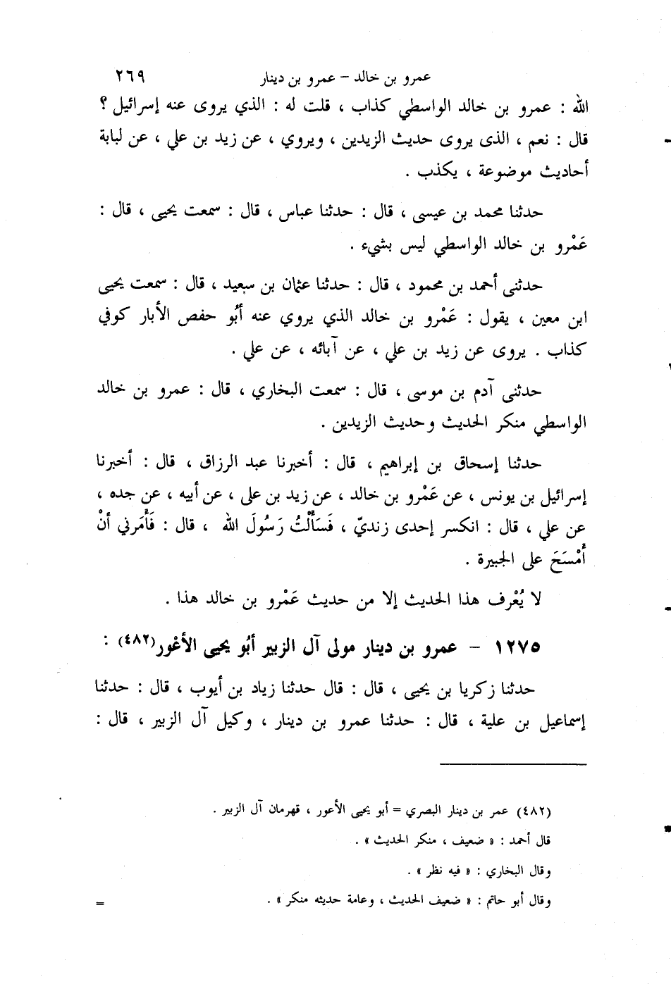 §1275 - عَمْرُو بْنُ دِينَارٍ مَوْلَى آلِ الزُّبَيْرِ أَبُو يَحْيَى الْأَعْوَرُ حَدَّثَنَا زَكَرِيَّا بْنُ يَحْيَى قَالَ: قَالَ: حَدَّثَنَا زِيَادُ بْنُ أَيُّوبَ قَالَ: حَدَّثَنَا إِسْمَاعِيلُ ابْنُ عُلَيَّةَ قَالَ: حَدَّثَنَا عَمْرُو بْنُ دِينَارٍ، وَكِيلُ آلِ الزُّبَيْرِ، قَالَ -[270]- إِسْمَاعِيلُ: لَمْ يَكُنْ هَذَا الشَّيْخُ يَحْفَظُ الْحَدِيثَ، قَالَ: وَقَدْ قَالَ أَكْثَرَ مِنْ هَذَا حَدَّثَنِي آدَمُ بْنُ مُوسَى قَالَ: سَمِعْتُ الْبُخَارِيَّ قَالَ: عَمْرُو بْنُ دِينَارٍ مَوْلَى آلِ الزُّبَيْرِ أَبُو يَحْيَى الْأَعْوَرُ، عَنْ سَالِمٍ، فِيهِ نَظَرٌ