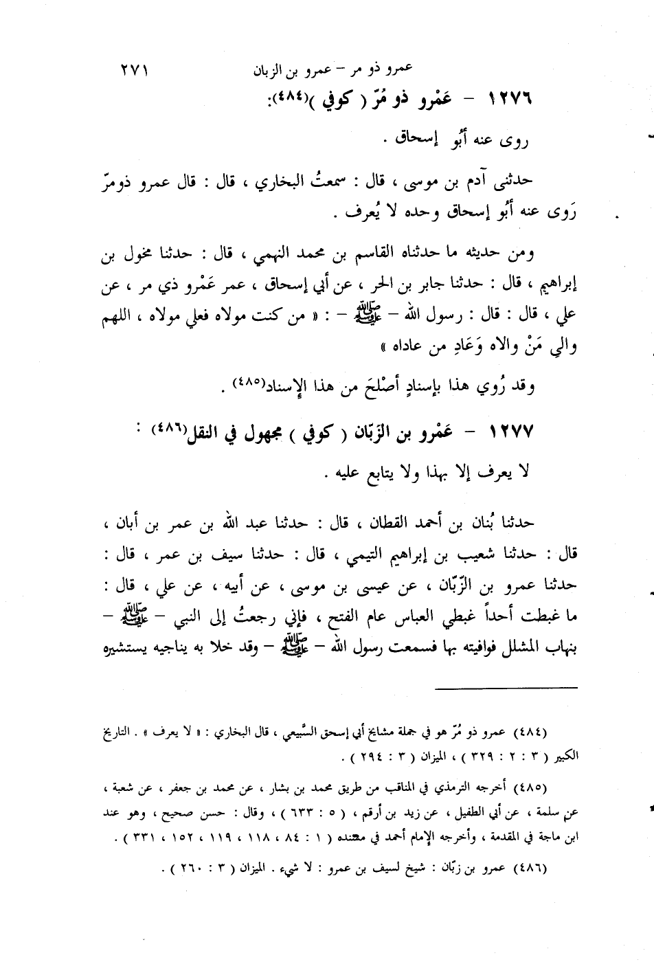 §1276 - عَمْرٌو ذُو مُرٍّ كُوفِيٌّ رَوَى عَنْهُ أَبُو إِسْحَاقَ. حَدَّثَنِي آدَمُ بْنُ مُوسَى قَالَ: سَمِعْتُ الْبُخَارِيَّ قَالَ: عَمْرٌو ذُو مُرٍّ رَوَى عَنْهُ أَبُو إِسْحَاقَ وَحْدَهُ، لَا يُعْرَفُ