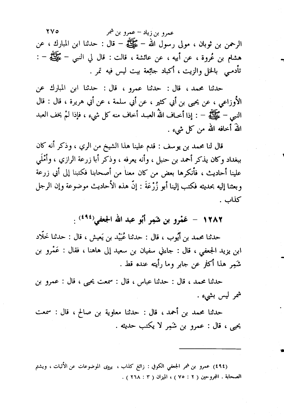 §1282 - عَمْرُو بْنُ شَمِرٍ أَبُو عَبْدِ اللَّهِ الْجُعْفِيُّ حَدَّثَنَا مُحَمَّدُ بْنُ أَيُّوبَ قَالَ: حَدَّثَنَا عُبَيْدُ بْنُ يَعِيشَ قَالَ: حَدَّثَنَا خَلَّادُ بْنُ يَزِيدَ الْجُعْفِيُّ، قَالَ جَاءَنِي سُفْيَانُ بْنُ سَعِيدٍ إِلَى هَاهُنَا فَقَالَ: عَمْرُو بْنُ شَمِرٍ هَذَا أَكْثَرَ عَنْ جَابِرٍ، وَمَا رَأَيْتُهُ عِنْدَهُ قَطُّ. حَدَّثَنَا مُحَمَّدٌ قَالَ: حَدَّثَنَا عَبَّاسٌ قَالَ: سَمِعْتُ يَحْيَى قَالَ: عَمْرُو بْنُ شَمِرٍ لَيْسَ بِشَيْءٍ. حَدَّثَنَا مُحَمَّدُ بْنُ أَحْمَدَ قَالَ: حَدَّثَنَا مُعَاوِيَةُ بْنُ صَالِحٍ قَالَ: سَمِعْتُ يَحْيَى قَالَ: عَمْرُو بْنُ شَمِرٍ لَا يُكْتَبُ حَدِيثُهُ. حَدَّثَنِي آدَمُ بْنُ مُوسَى قَالَ: سَمِعْتُ الْبُخَارِيَّ قَالَ: عَمْرُو بْنُ شَمِرٍ مُنْكَرُ الْحَدِيثِ
