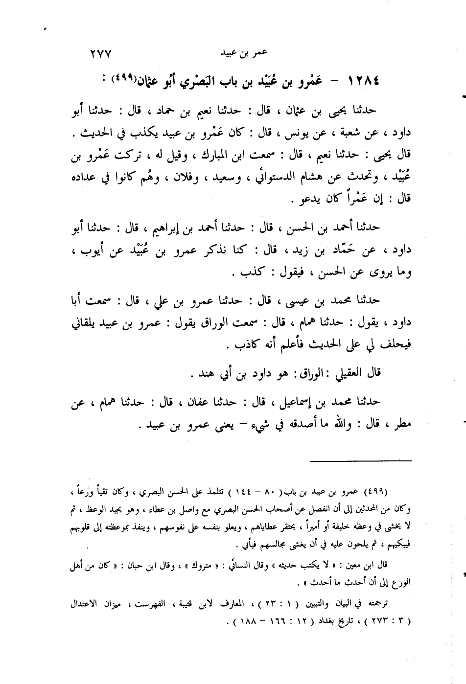 §1284 - عَمْرُو بْنُ عُبَيْدِ بْنِ بَابٍ الْبَصْرِيُّ أَبُو عُثْمَانَ حَدَّثَنَا يَحْيَى بْنُ عُثْمَانَ قَالَ: حَدَّثَنَا نُعَيْمُ بْنُ حَمَّادٍ قَالَ: حَدَّثَنَا أَبُو دَاوُدَ، عَنْ شُعْبَةَ، عَنْ يُونُسَ قَالَ: كَانَ عَمْرُو بْنُ عُبَيْدٍ يَكْذِبُ فِي الْحَدِيثِ. قَالَ يَحْيَى: حَدَّثَنَا نُعَيْمٌ قَالَ: سَمِعْتُ ابْنَ الْمُبَارَكِ، وَقِيلَ لَهُ: تَرَكْتَ عَمْرَو بْنَ عُبَيْدٍ وَتُحَدِّثُ عَنْ هِشَامٍ الدَّسْتُوَائِيِّ، وَسَعِيدٍ، وَفُلَانٍ، وَهُمْ كَانُوا فِي عِدَادِهِ، قَالَ: إِنَّ عَمْرًا كَانَ يَدْعُو. حَدَّثَنَا أَحْمَدُ بْنُ الْحَسَنِ قَالَ: حَدَّثَنَا أَحْمَدُ بْنُ إِبْرَاهِيمَ قَالَ: حَدَّثَنَا أَبُو دَاوُدَ، عَنْ حَمَّادِ بْنِ زَيْدٍ قَالَ: كُنَّا نَذْكُرُ عَمْرَو بْنَ عُبَيْدٍ، عَنْ أَيُّوبَ، وَمَا يُرْوَى عَنِ الْحَسَنِ، فَيَقُولُ: كَذَبَ. حَدَّثَنَا مُحَمَّدُ بْنُ عِيسَى قَالَ: حَدَّثَنَا عَمْرُو بْنُ عَلِيٍّ قَالَ: سَمِعْتُ أَبَا دَاوُدَ يَقُولُ: حَدَّثَنَا هَمَّامٌ قَالَ: سَمِعْتُ الْوَرَّاقَ يَقُولُ: عَمْرُو بْنُ عُبَيْدٍ يَلْقَانِي فَيَحْلِفُ لِي عَلَى الْحَدِيثِ فَأَعْلَمُ أَنَّهُ كَاذِبٌ. قَالَ الْعُقَيْلِيُّ: الْوَرَّاقُ هُوَ دَاوُدُ بْنُ أَبِي هِنْدَ. حَدَّثَنَا مُحَمَّدُ بْنُ إِسْمَاعِيلَ قَالَ: حَدَّثَنَا عَفَّانُ قَالَ: حَدَّثَنَا هَمَّامٌ، عَنْ مَطَرٍ قَالَ: وَاللَّهِ مَا أُصَدِّقُهُ فِي شَيْءٍ، يَعْنِي عَمْرَو بْنَ عُبَيْدٍ -[278]-. حَدَّثَنَا إِبْرَاهِيمُ بْنُ مُحَمَّدٍ قَالَ: حَدَّثَنَا سُلَيْمَانُ بْنُ حَرْبٍ قَالَ: حَدَّثَنَا حَمَّادُ بْنُ زَيْدٍ قَالَ: حَدَّثَنَا أَيُّوبُ، عَنْ عَمْرِو بْنِ عُبَيْدٍ، عَنِ الْحَسَنِ، أَنَّ السَّكْرَانَ مِنَ النَّبِيذِ لَا يُجْلَدُ، فَقَالَ: كَذَبَ، أَنَا سَمِعْتُ الْحَسَنَ يَقُولُ: يُجْلَدُ. حَدَّثَنَا مُحَمَّدُ بْنُ إِبْرَاهِيمَ قَالَ: حَدَّثَنَا مُسْلِمٌ قَالَ: حَدَّثَنَا سَلَّامُ بْنُ أَبِي مُطِيعٍ قَالَ: حَدَّثَنِي الْمَكْتُومُ عَمْرُو بْنُ عُبَيْدٍ