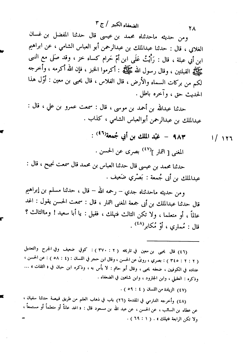 §983 - عَبْدُ الْمَلِكِ بْنُ أَبِي جُمُعَةَ الْمُغْنِيُّ بَصْرِيٌّ، عَنِ الْحَسَنِ. حَدَّثَنَا مُحَمَّدُ بْنُ عِيسَى قَالَ: حَدَّثَنَا الْعَبَّاسُ بْنُ مُحَمَّدٍ قَالَ: سَمِعْتُ يَحْيَي قَالَ: عَبْدُ الْمَلِكِ بْنُ أَبِي جُمُعَةَ بَصْرِيٌّ ضَعِيفٌ
