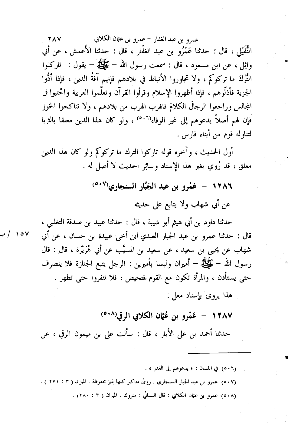 §1287 - عَمْرُو بْنُ عُثْمَانَ الْكِلَابِيُّ الرَّقِّيُّ حَدَّثَنَا أَحْمَدُ بْنُ عَلِيٍّ الْأَبَّارُ قَالَ: سَأَلْتُ عَلِيَّ بْنَ مَيْمُونٍ الرَّقِّيَّ عَنْ عَمْرِو بْنِ عُثْمَانَ الْكِلَابِيِّ، فَقَالَ: كَانَ إِنْسَانٌ عِنْدَنَا يُقَالَ لَهُ أَبُو مَطَرٍ، فَجَاءَنِي ابْنُهُ بِكُتُبِهِ لِبَيْعِهَا لَهُ، فَقَالَ لِي عَمْرُو بْنُ عُثْمَانَ الْكِلَابِيُّ: جِئْنِي بِشَيْءٍ مِنْهَا، فَجِئْتُ، فَكَانَ يُحَدِّثُ مِنْهَا، فَلَمَّا مَاتَ عَمْرُو بْنُ عُثْمَانَ رَدُّوهَا عَلَيَّ، فَرَدَّدْتُهَا عَلَى أَهْلِهَا