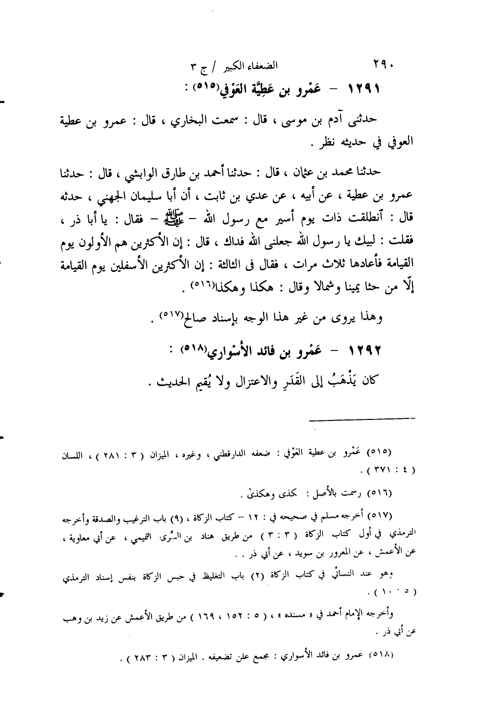 §1291 - عَمْرُو بْنُ عَطِيَّةَ الْعَوْفِيُّ حَدَّثَنِي آدَمُ بْنُ مُوسَى قَالَ: سَمِعْتُ الْبُخَارِيَّ قَالَ: عَمْرُو بْنُ عَطِيَّةَ الْعَوْفِيُّ فِي حَدِيثِهِ نَظَرٌ