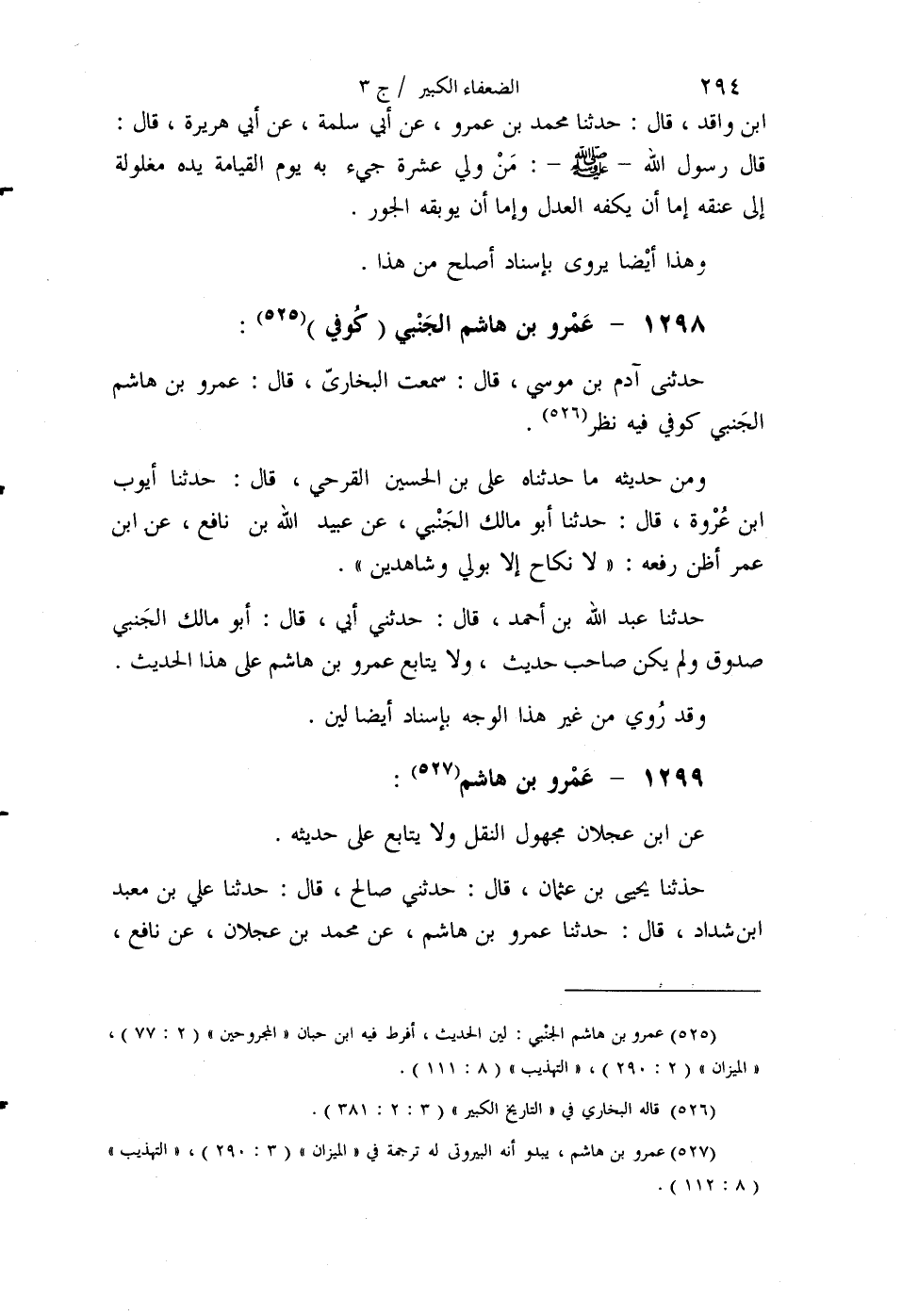 §1298 - عَمْرُو بْنُ هَاشِمٍ الْجَنْبِيُّ كُوفِيٌّ حَدَّثَنِي آدَمُ بْنُ مُوسَى قَالَ: سَمِعْتُ الْبُخَارِيَّ قَالَ: عَمْرُو بْنُ هَاشِمٍ الْجَنْبِيُّ كُوفِيٌّ فِيهِ نَظَرٌ