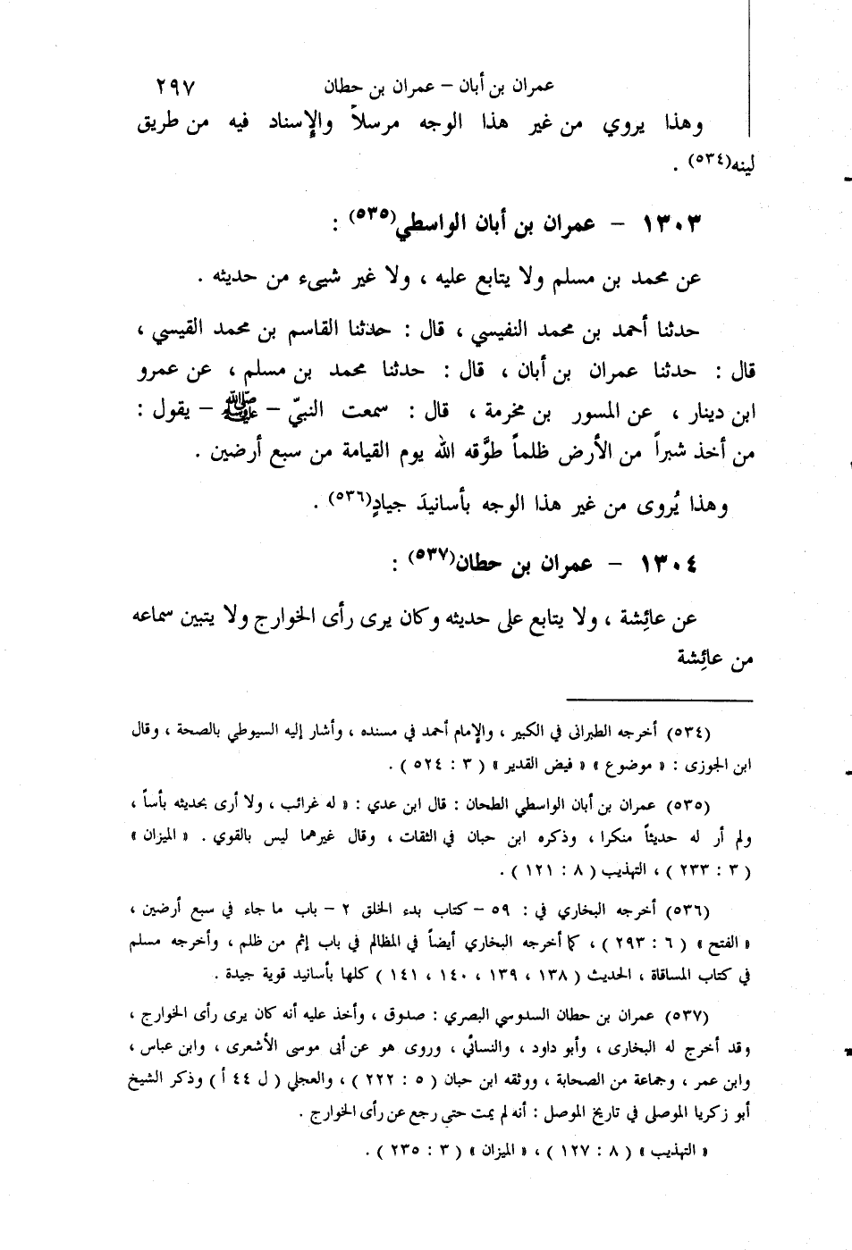 §1304 - عِمْرَانُ بْنُ حِطَّانَ عَنْ عَائِشَةَ، وَلَا يُتَابَعُ عَلَى حَدِيثِهِ، وَكَانَ يَرَى رَأْيَ الْخَوَارِجِ، وَلَا يَتَبَيَّنُ سَمَاعُهُ مِنْ عَائِشَةَ