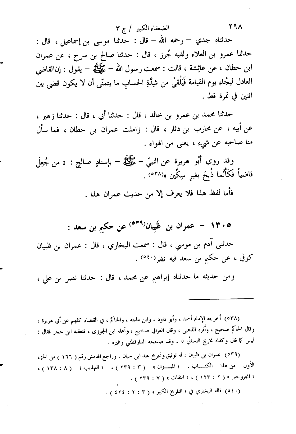 §1305 - عِمْرَانُ بْنُ ظَبْيَانَ عَنْ حَكِيمِ بْنِ سَعْدٍ. حَدَّثَنِي آدَمُ بْنُ مُوسَى قَالَ: سَمِعْتُ الْبُخَارِيَّ قَالَ: عِمْرَانُ بْنُ ظَبْيَانَ كُوفِيٌّ، عَنْ حَكِيمِ بْنِ سَعْدٍ، فِيهِ نَظَرٌ