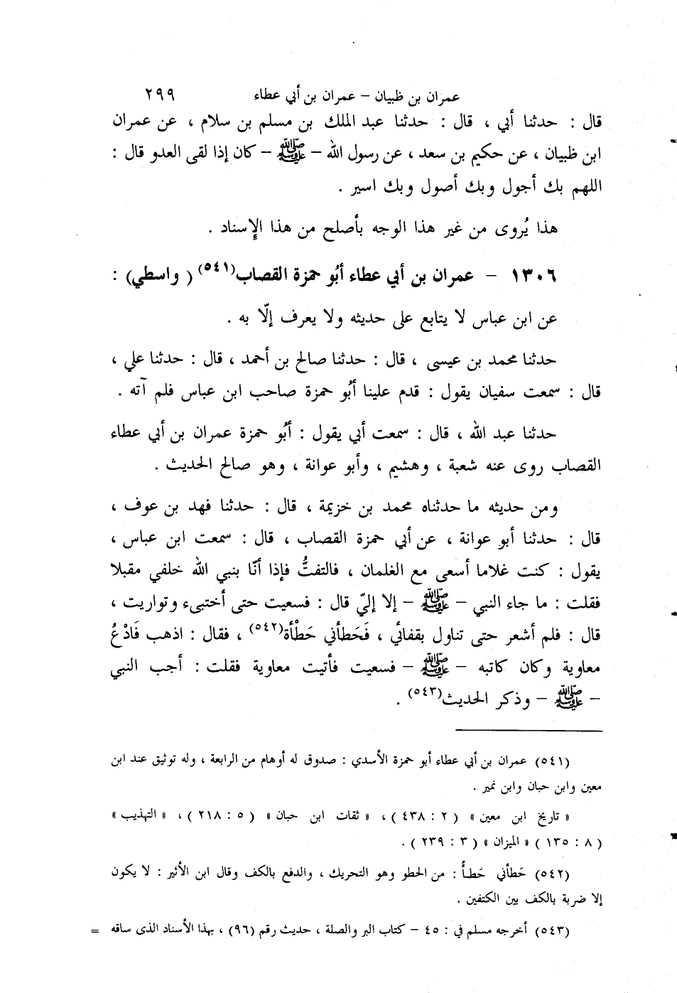 §1306 - عِمْرَانُ بْنُ أَبِي عَطَاءٍ أَبُو حَمْزَةَ الْقَصَّابُ وَاسِطِيٌّ عَنِ ابْنِ عَبَّاسٍ، لَا يُتَابَعُ عَلَى حَدِيثِهِ، وَلَا يُعْرَفُ إِلَّا بِهِ. حَدَّثَنَا مُحَمَّدُ بْنُ عِيسَى قَالَ: حَدَّثَنَا صَالِحُ بْنُ أَحْمَدَ قَالَ: حَدَّثَنَا عَلِيٌّ قَالَ: سَمِعْتُ سُفْيَانَ يَقُولُ: قَدِمَ عَلَيْنَا أَبُو حَمْزَةَ صَاحِبُ ابْنِ عَبَّاسٍ فَلَمْ آتِهِ. حَدَّثَنَا عَبْدُ اللَّهِ قَالَ: سَمِعْتُ أَبِي يَقُولُ: أَبُو حَمْزَةَ عِمْرَانُ بْنُ أَبِي عَطَاءٍ الْقَصَّابُ رَوَى عَنْهُ، شُعْبَةُ وَهُشَيْمٌ وَأَبُو عَوَانَةَ وَهُوَ صَالِحُ الْحَدِيثِ