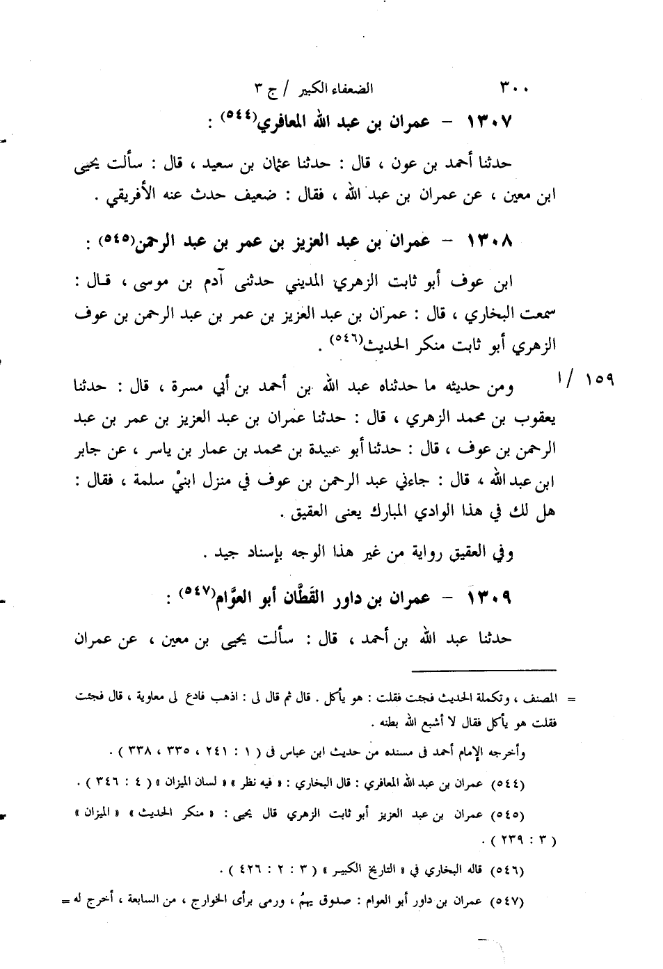 §1307 - عِمْرَانُ بْنُ عَبْدِ اللَّهِ الْمَعَافِرِيُّ حَدَّثَنَا أَحْمَدُ بْنُ عَوْنٍ قَالَ: حَدَّثَنَا عُثْمَانُ بْنُ سَعِيدٍ قَالَ: سَأَلْتُ يَحْيَى بْنَ مَعِينٍ عَنْ عِمْرَانَ بْنِ عَبْدِ اللَّهِ، فَقَالَ: ضَعِيفٌ، حَدَّثَ عَنْهُ الْإِفْرِيقِيُّ