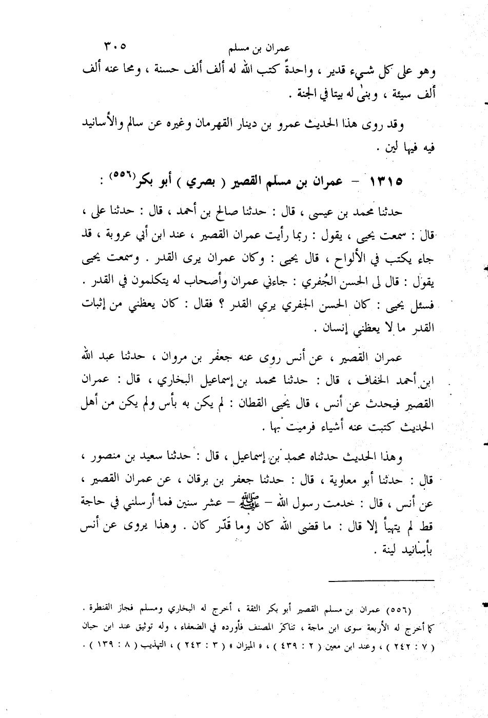 §1315 - عِمْرَانُ بْنُ مُسْلِمٍ الْقَصِيرُ بَصْرِيٌّ أَبُو بَكْرٍ حَدَّثَنَا مُحَمَّدُ بْنُ عِيسَى قَالَ: حَدَّثَنَا صَالِحُ بْنُ أَحْمَدَ قَالَ: حَدَّثَنَا عَلِيٌّ قَالَ: سَمِعْتُ يَحْيَى يَقُولُ: رُبَّمَا رَأَيْتُ عِمْرَانَ الْقَصِيرَ عِنْدَ ابْنِ أَبِي عَرُوبَةَ قَدْ جَاءَ يَكْتُبُ فِي الْأَلْوَاحِ، قَالَ يَحْيَى: وَكَانَ عِمْرَانُ يَرَى الْقَدَرَ، وَسَمِعْتُ يَحْيَى يَقُولُ: قَالَ لِيَ الْحَسَنُ الْجُفْرِيُّ: جَاءَنِي عِمْرَانُ وَأَصْحَابٌ لَهُ يَتَكَلَّمُونَ فِي الْقَدَرِ فَسُئِلَ يَحْيَى: كَانَ الْحَسَنُ الْجُفْرِيُّ يَرَى الْقَدَرَ؟ فَقَالَ: كَانَ يَعِظُنِي مِنْ إِثْبَاتِ الْقَدَرِ مَا لَا يَعِظُنِي إِنْسَانٌ. عِمْرَانُ الْقَصِيرُ، عَنْ أَنَسٍ، رَوَى عَنْهُ، جَعْفَرُ بْنُ مَرْوَانَ. حَدَّثَنَا عَبْدُ اللَّهِ بْنُ أَحْمَدَ الْخَفَّافُ قَالَ: حَدَّثَنَا مُحَمَّدُ بْنُ إِسْمَاعِيلَ الْبُخَارِيُّ قَالَ: عِمْرَانُ الْقَصِيرُ فَيُحَدِّثُ عَنْ أَنَسٍ، قَالَ يَحْيَى الْقَطَّانُ: لَمْ يَكُنْ بِهِ بَأْسٌ، وَلَمْ يَكُنْ مِنْ أَهْلِ الْحَدِيثِ، كَتَبْتُ عَنْهُ أَشْيَاءَ فَرَمَيْتُ بِهَا