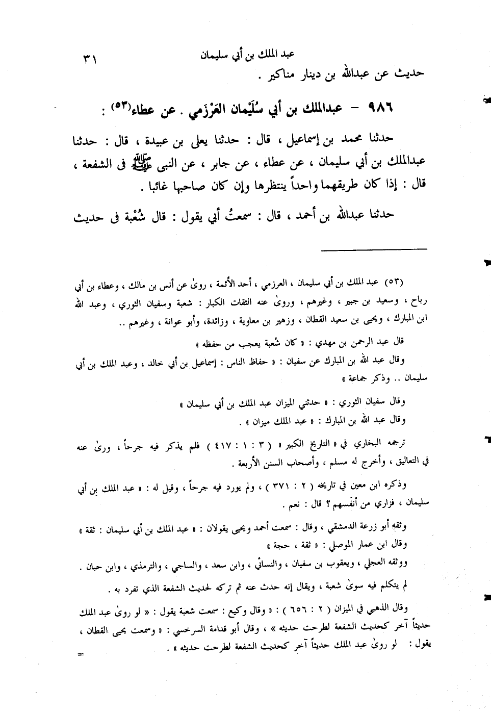 §986 - عَبْدُ الْمَلِكِ بْنُ أَبِي سُلَيْمَانَ الْعَرْزَمِيُّ عَنْ عَطَاءٍ