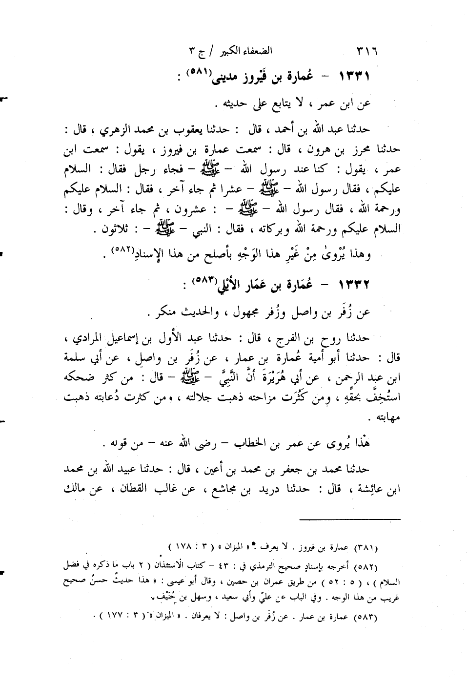 §1331 - عُمَارَةُ بْنُ فَيْرُوزَ مَدِينِيٌّ عَنِ ابْنِ عُمَرَ، لَا يُتَابَعُ عَلَى حَدِيثِهِ