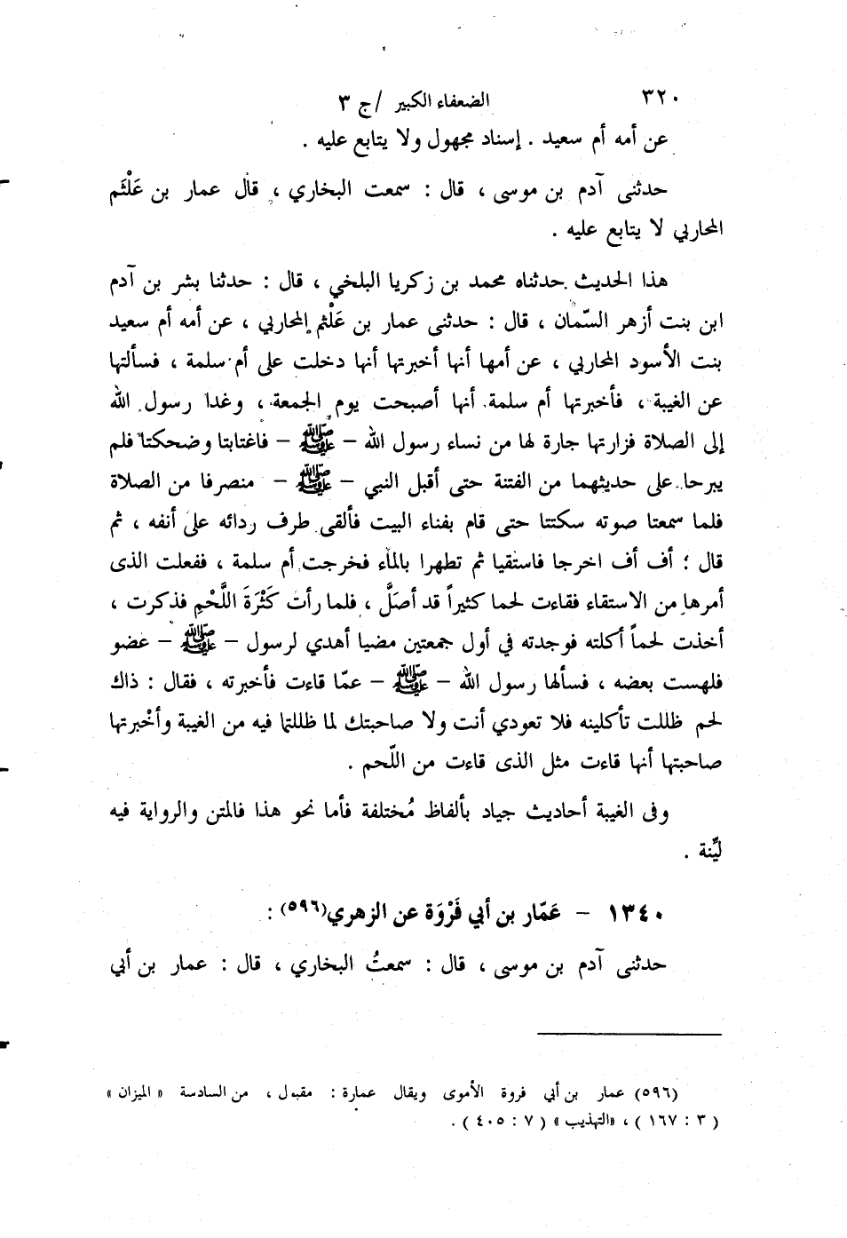 §1340 - عَمَّارُ بْنُ أَبِي فَرْوَةَ عَنِ الزُّهْرِيِّ. حَدَّثَنِي آدَمُ بْنُ مُوسَى قَالَ: سَمِعْتُ الْبُخَارِيَّ قَالَ: عَمَّارُ بْنُ أَبِي -[321]- فَرْوَةَ عَنِ الزُّهْرِيِّ، لَا يُتَابَعُ عَلَى حَدِيثِهِ