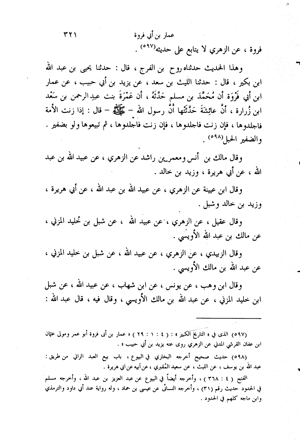 وَهَذَا الْحَدِيثُ حَدَّثَنَاهُ رَوْحُ بْنُ الْفَرَجِ قَالَ: حَدَّثَنَا يَحْيَى بْنُ عَبْدِ اللَّهِ بْنِ بُكَيْرٍ قَالَ: حَدَّثَنَا اللَّيْثُ بْنُ سَعْدٍ، عَنْ يَزِيدَ بْنِ أَبِي حَبِيبٍ، عَنْ عَمَّارِ بْنِ أَبِي فَرْوَةَ، أَنَّ مُحَمَّدَ بْنَ مُسْلِمٍ، حَدَّثَهُ أَنَّ عَمْرَةَ بِنْتَ عَبْدِ الرَّحْمَنِ بْنِ سَعْدِ بْنِ زُرَارَةَ أَنَّ عَائِشَةَ حَدَّثَتْهَا أَنَّ رَسُولَ اللَّهِ صَلَّى اللهُ عَلَيْهِ وَسَلَّمَ قَالَ: «§إِذَا زَنَتِ الْأَمَةُ فَاجْلِدُوهَا، فَإِنْ زَنَتْ فَاجْلِدُوهَا، فَإِنْ زَنَتْ فَاجْلِدُوهَا، ثُمَّ تَبِيعُوهَا وَلَوْ بِضَفِيرٍ» وَالضَّفِيرُ: الْحَبْلُ. وَقَالَ مَالِكُ بْنُ أَنَسٍ وَمَعْمَرُ بْنُ رَاشِدٍ عَنِ الزُّهْرِيِّ، عَنْ عُبَيْدِ اللَّهِ بْنِ عَبْدِ اللَّهِ، عَنْ أَبِي هُرَيْرَةَ وَزَيْدِ بْنِ خَالِدٍ. وَقَالَ ابْنُ عُيَيْنَةَ عَنِ الزُّهْرِيِّ، عَنْ عُبَيْدِ اللَّهِ بْنِ عَبْدِ اللَّهِ، عَنْ أَبِي هُرَيْرَةَ وَزَيْدِ بْنِ خَالِدٍ وَشِبْلٍ. وَقَالَ عَقِيلٌ عَنِ الزُّهْرِيِّ، عَنْ عُبَيْدِ اللَّهِ، عَنْ شِبْلِ بْنِ خُلَيْدٍ الْمُزَنِيِّ، عَنْ مَالِكِ بْنِ عَبْدِ اللَّهِ الْأُوَيْسِيِّ. وَقَالَ الزُّبَيْدِيُّ: عَنِ الزُّهْرِيِّ، عَنْ عُبَيْدِ اللَّهِ، عَنْ شِبْلِ بْنِ خُلَيْدٍ الْمُزَنِيِّ، عَنْ عَبْدِ اللَّهِ بْنِ مَالِكٍ الْأُوَيْسِيِّ. وَقَالَ ابْنُ وَهْبٍ، عَنْ يُونُسَ، عَنِ ابْنِ شِهَابٍ، عَنْ عُبَيْدِ اللَّهِ، عَنْ شِبْلِ بْنِ خُلَيْدٍ الْمُزَنِيِّ، عَنْ عَبْدِ اللَّهِ بْنِ مَالِكٍ الْأُوَيْسِيِّ، وَقَالَ فِيهِ: قَالَ عَبْدُ اللَّهِ -[322]-: أَخْبَرَنِي زَيْدُ بْنُ خَالِدٍ، عَنِ النَّبِيِّ صَلَّى اللهُ عَلَيْهِ وَسَلَّمَ نَحْوَهُ. وَقَالَ ابْنُ أَخِي الزُّهْرِيِّ عَنِ الزُّهْرِيِّ، عَنْ عُبَيْدِ اللَّهِ، عَنْ شِبْلِ بْنِ خُلَيْدٍ الْمُزَنِيِّ، عَنْ عَبْدِ اللَّهِ بْنِ مَالِكٍ الْأَوْسِيِّ قَالَ جَرِيرُ بْنُ عَبْدِ الْحَمِيدِ، عَنْ مَنْصُورٍ، عَنِ الزُّهْرِيِّ، عَنْ زَيْدِ بْنِ خُلَيْدَةَ أَوْ غَيْرِهِ، عَنْ أَبِي هُرَيْرَةَ. وَقَالَ إِسْحَاقُ بْنُ رَاشِدٍ، عَنْ مَالِكٍ، عَنْ حُمَيْدِ بْنِ عَبْدِ الرَّحْمَنِ، عَنْ أَبِي هُرَيْرَةَ. وَالْمَحْفُوظُ رِوَايَةُ مَعْمَرٍ وَمَالِكٍ وَيُونُسَ وَعُقَيْلٍ، وَهُمَا حَدِيثَانِ عِنْدَ الزُّهْرِيِّ، عَنْ عُبَيْدِ اللَّهِ، عَنْ أَبِي هُرَيْرَةَ وَزَيْدِ بْنِ خَالِدٍ وَعَنْ عُبَيْدِ اللَّهِ، عَنْ شِبْلِ بْنِ خَالِدٍ، عَنْ عَبْدِ اللَّهِ بْنِ مَالِكٍ الْأُوَيْسِيِّ، وَسَائِرُ ذَلِكَ غَيْرُ مَحْفُوظٍ