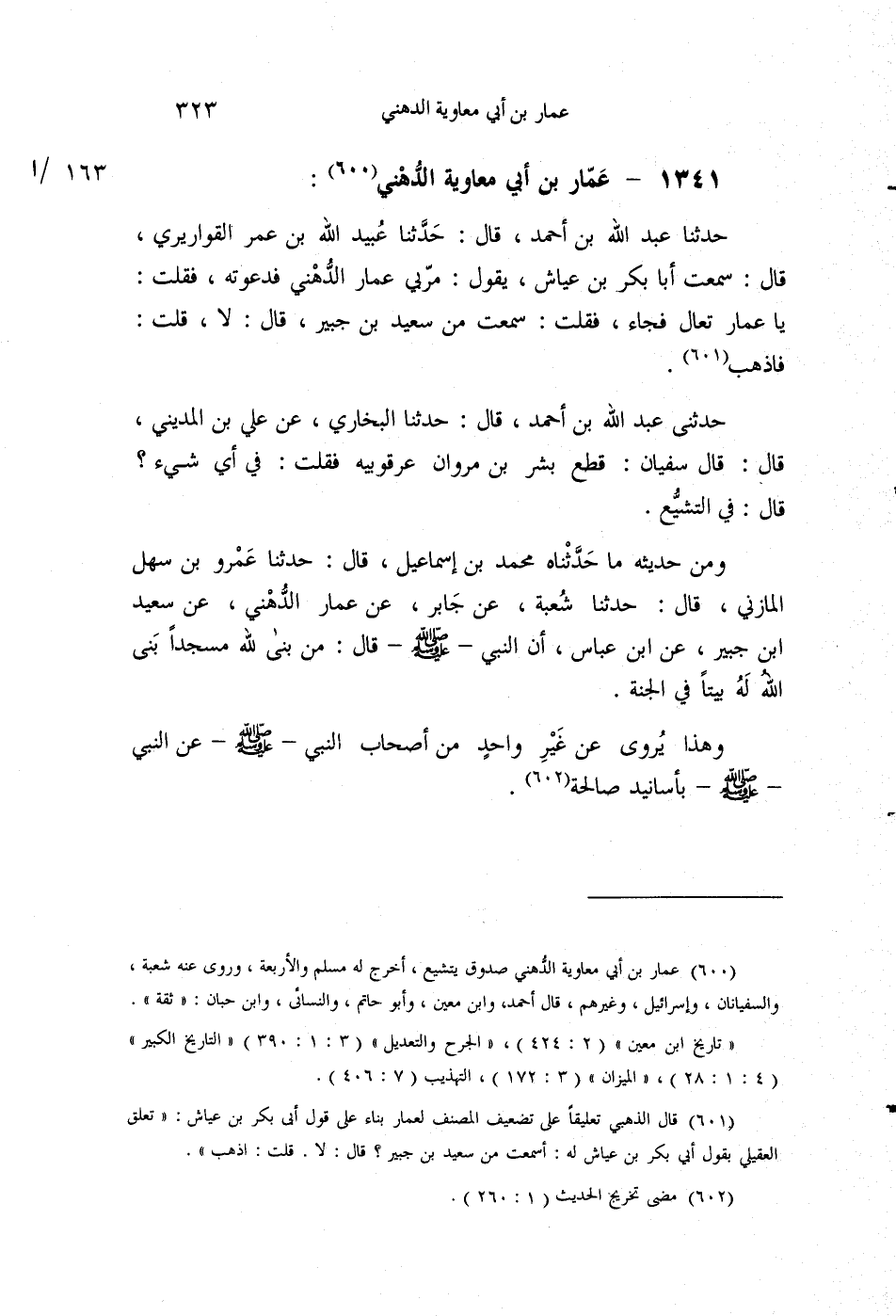 §1341 - عَمَّارُ بْنُ أَبِي مُعَاوِيَةَ الدُّهْنِيُّ حَدَّثَنَا عَبْدُ اللَّهِ بْنُ أَحْمَدَ قَالَ: حَدَّثَنَا عُبَيْدُ اللَّهِ بْنُ عُمَرَ الْقَوَارِيرِيُّ قَالَ: سَمِعْتُ أَبَا بَكْرِ بْنَ عَيَّاشٍ يَقُولُ: مَرَّ بِي عَمَّارٌ الدُّهْنِيُّ فَدَعَوْتُهُ فَقُلْتُ: يَا عَمَّارُ، تَعَالَ، فَجَاءَ، فَقُلْتُ: سَمِعْتَ مِنَ سَعِيدِ بْنِ جُبَيْرٍ؟ قَالَ: لَا، قُلْتُ: فَاذْهَبْ. حَدَّثَنِي عَبْدُ اللَّهِ بْنُ أَحْمَدَ قَالَ: حَدَّثَنَا الْبُخَارِيُّ، عَنْ عَلِيِّ بْنِ الْمَدِينِيِّ قَالَ: قَالَ سُفْيَانُ: قَطَعَ بِشْرُ بْنُ مَرْوَانَ عُرْقُوبَيْهِ، فَقُلْتُ: فِي أَيِّ شَيْءٍ؟ قَالَ: فِي التَّشَيُّعِ