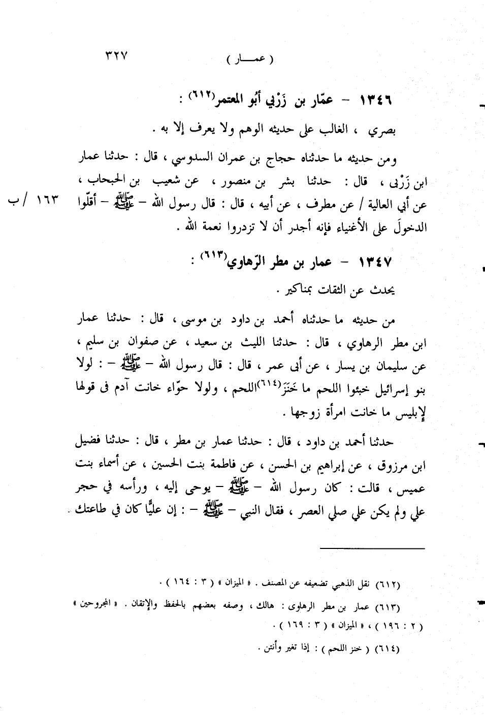 §1346 - عَمَّارُ بْنُ زَرْبِيٍّ أَبُو الْمُعْتَمِرِ بَصْرِيٌّ، الْغَالِبُ عَلَى حَدِيثِهِ الْوَهْمُ، وَلَا يُعْرَفُ إِلَّا بِهِ
