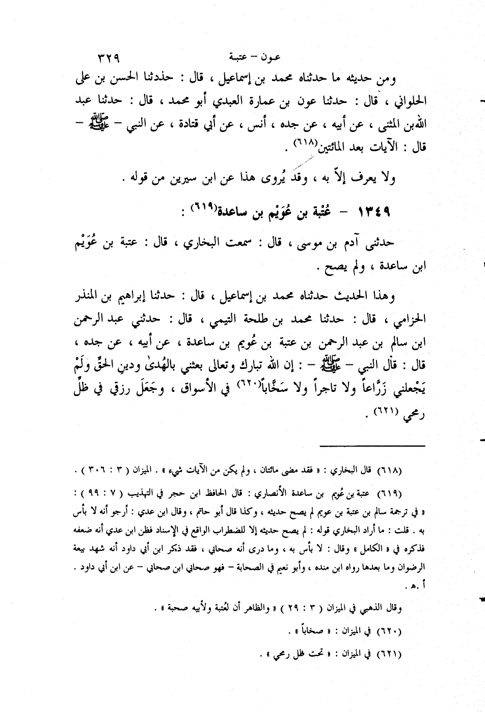 §1349 - عُتْبَةُ بْنُ عُوَيْمِ بْنِ سَاعِدَةَ حَدَّثَنِي آدَمُ بْنُ مُوسَى قَالَ: سَمِعْتُ الْبُخَارِيَّ قَالَ: عُتْبَةُ بْنُ عُوَيْمِ بْنِ سَاعِدَةَ، وَلَمْ يَصِحَّ