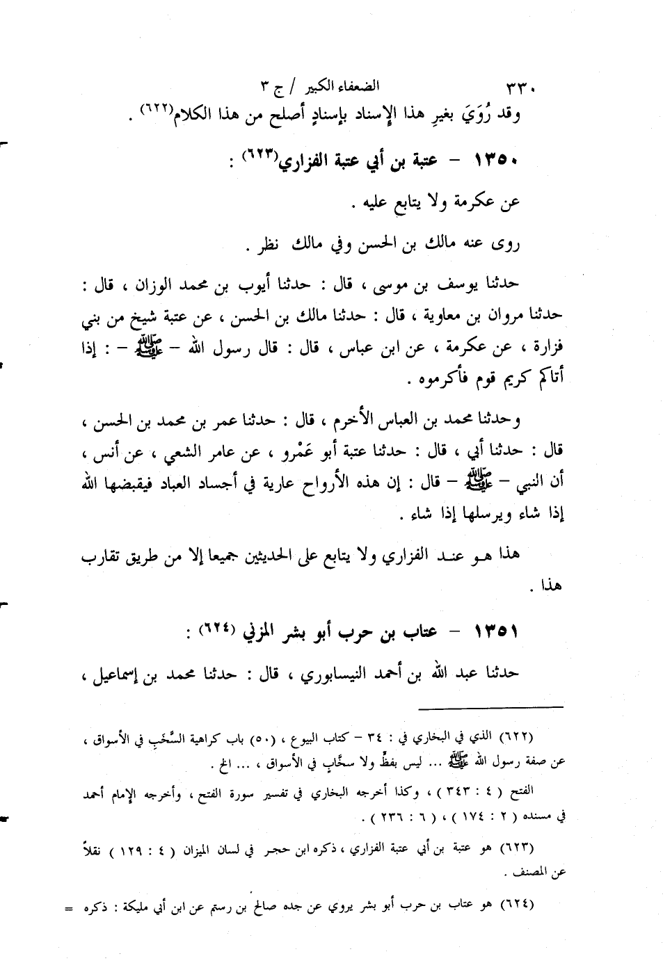 §1351 - عَتَّابُ بْنُ حَرْبٍ أَبُو بِشْرٍ الْمُزَنِيُّ حَدَّثَنَا عَبْدُ اللَّهِ بْنُ أَحْمَدَ النَّيْسَابُورِيُّ قَالَ: حَدَّثَنَا مُحَمَّدُ بْنُ إِسْمَاعِيلَ قَالَ: قَالَ عَمْرُو بْنُ عَلِيٍّ: عَتَّابُ بْنُ حَرْبٍ الْمُزَنِيُّ ضَعِيفٌ جِدًّا، يُحَدِّثُ عَنْ صَالِحِ بْنِ رُسْتُمَ