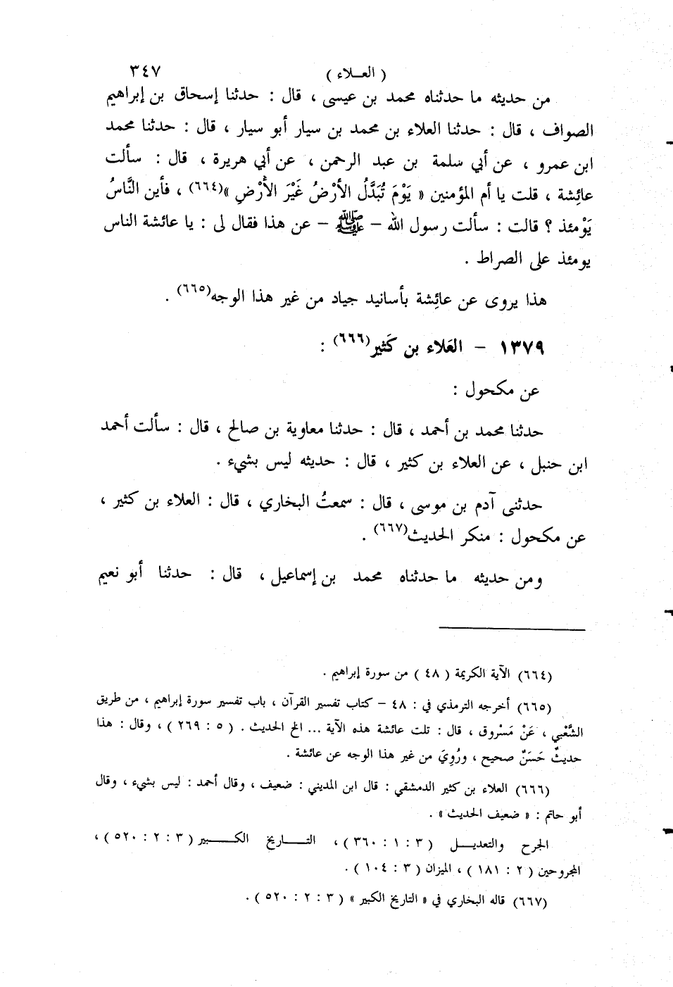 §1379 - الْعَلَاءُ بْنُ كَثِيرٍ عَنْ مَكْحُولٍ. حَدَّثَنَا مُحَمَّدُ بْنُ أَحْمَدَ قَالَ: حَدَّثَنَا مُعَاوِيَةُ بْنُ صَالِحٍ قَالَ: سَأَلْتُ أَحْمَدَ بْنَ حَنْبَلٍ عَنِ الْعَلَاءِ بْنِ كَثِيرٍ قَالَ: حَدِيثُهُ لَيْسَ بِشَيْءٍ. حَدَّثَنِي آدَمُ بْنُ مُوسَى قَالَ: سَمِعْتُ الْبُخَارِيَّ قَالَ: الْعَلَاءُ بْنُ كَثِيرٍ عَنْ مَكْحُولٍ، مُنْكَرُ الْحَدِيثِ