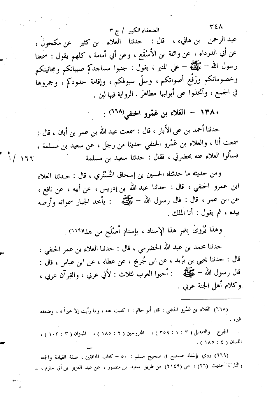 حَدَّثَنَا مُحَمَّدُ بْنُ عَبْدِ اللَّهِ الْحَضْرَمِيُّ قَالَ: حَدَّثَنَا الْعَلَاءُ بْنُ عُمَرَ الْحَنَفِيُّ قَالَ: حَدَّثَنَا يَحْيَى بْنُ بُرَيْدٍ، عَنِ ابْنِ جُرَيْجٍ، عَنْ عَطَاءٍ، عَنِ ابْنِ عَبَّاسٍ قَالَ: قَالَ رَسُولُ اللَّهِ صَلَّى اللهُ عَلَيْهِ وَسَلَّمَ: " §أَحِبُّوا الْعَرَبَ لِثَلَاثٍ: لِأَنِّي عَرَبِيُّ وَالْقُرْآنَ عَرَبِيُّ وَكَلَامَ أَهْلِ الْجَنَّةِ عَرَبِيُّ " مُنْكَرٌ لَا أَصْلَ لَهُ