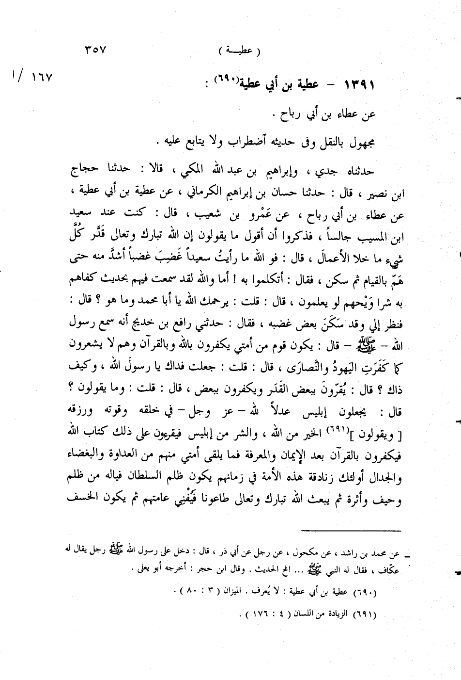 §1391 - عَطِيَّةُ بْنُ أَبِي عَطِيَّةَ عَنْ عَطَاءِ بْنِ أَبِي رَبَاحٍ، مَجْهُولٌ بِالنَّقْلِ، وَفِي حَدِيثِهِ اضْطِرَابٌ، وَلَا يُتَابَعُ عَلَيْهِ