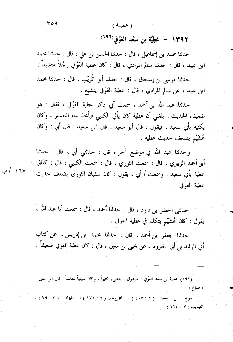 §1392 - عَطِيَّةُ بْنُ سَعْدٍ الْعَوْفِيُّ حَدَّثَنَا مُحَمَّدُ بْنُ إِسْمَاعِيلَ قَالَ: حَدَّثَنَا الْحَسَنُ بْنُ عَلِيٍّ قَالَ: حَدَّثَنَا مُحَمَّدُ بْنُ عُبَيْدٍ قَالَ: حَدَّثَنَا سَالِمٌ الْمُرَادِيُّ قَالَ: كَانَ عَطِيَّةُ الْعَوْفِيُّ رَجُلًا مُتَشَيِّعًا حَدَّثَنَا مُوسَى بْنُ إِسْحَاقَ قَالَ: حَدَّثَنَا أَبُو كُرَيْبٍ قَالَ: حَدَّثَنَا مُحَمَّدُ بْنُ عُبَيْدٍ، عَنْ سَالِمٍ الْمُرَادِيِّ قَالَ: عَطِيَّةُ الْعَوْفِيُّ يَتَشَيَّعُ حَدَّثَنَا عَبْدُ اللَّهِ بْنُ أَحْمَدَ: سَمِعْتُ أَبِي ذَكَرَ عَطِيَّةَ الْعَوْفِيَّ فَقَالَ: هُوَ ضَعِيفُ الْحَدِيثِ، بَلَغَنِي أَنَّ عَطِيَّةَ كَانَ يَأْتِي الْكَلْبِيَّ فَيَأْخُذُ عَنْهُ التَّفْسِيرَ وَكَانَ يُكَنِّيهِ بِأَبِي سَعِيدٍ فَيَقُولُ: قَالَ أَبُو سَعِيدٍ، قَالَ ابْنُ سَعِيدٍ، قَالَ أَبِي، وَكَانَ هُشَيْمٌ يُضَعِّفُ حَدِيثَ عَطِيَّةَ وَحَدَّثَنَا عَبْدُ اللَّهِ، فِي مَوْضِعٍ آخَرَ قَالَ: حَدَّثَنِي أَبِي قَالَ: حَدَّثَنَا أَبُو أَحْمَدَ الزُّبَيْرِيُّ قَالَ: سَمِعْتُ الثَّوْرِيَّ قَالَ: سَمِعْتُ الْكَلْبِيَّ قَالَ: كَنَّانِي عَطِيَّةُ بِأَبِي سَعِيدٍ وَسَمِعْتُ أَبِي يَقُولُ: كَانَ سُفْيَانُ الثَّوْرِيُّ يُضَعِّفُ حَدِيثَ عَطِيَّةَ الْعَوْفِيِّ حَدَّثَنِي الْخَضِرُ بْنُ دَاوُدَ قَالَ: حَدَّثَنَا أَحْمَدُ قَالَ: سَمِعْتُ أَبَا عَبْدِ اللَّهِ يَقُولُ: كَانَ هُشَيْمٌ يَتَكَلَّمُ فِي عَطِيَّةَ الْعَوْفِيِّ حَدَّثَنَا جَعْفَرُ بْنُ أَحْمَدَ قَالَ: حَدَّثَنَا مُحَمَّدُ بْنُ إِدْرِيسَ، عَنْ كِتَابِ أَبِي الْوَلِيدِ بْنِ أَبِي الْجَارُودِ، عَنْ يَحْيَى بْنِ مَعِينٍ قَالَ: كَانَ عَطِيَّةُ الْعَوْفِيُّ ضَعِيفًا
