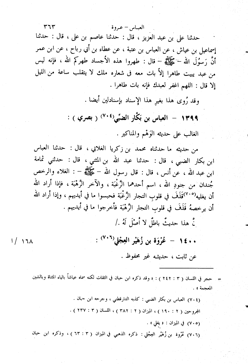 §1399 - الْعَبَّاسُ بْنُ بَكَّارٍ الضَّبِّيُّ بَصْرِيٌّ الْغَالِبُ عَلَى حَدِيثِهِ الْوَهْمُ وَالْمَنَاكِيرُ