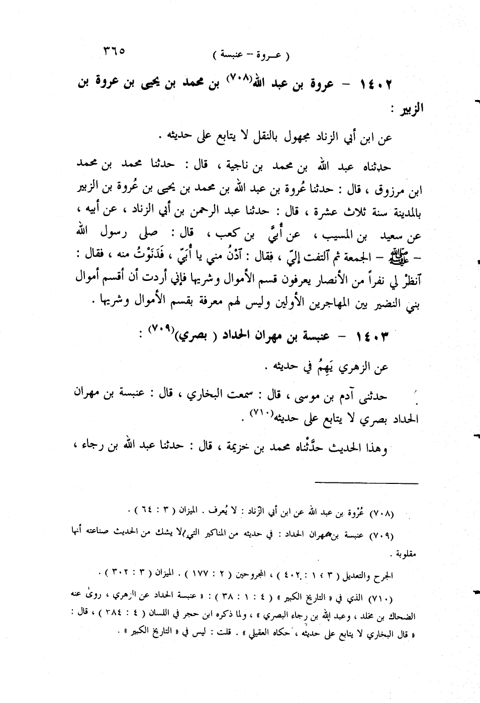 §1403 - عَنْبَسَةُ بْنُ مِهْرَانَ الْحَدَّادُ بَصْرِيٌّ عَنِ الزُّهْرِيِّ، يَهِمُ فِي حَدِيثِهِ. حَدَّثَنِي آدَمُ بْنُ مُوسَى قَالَ: سَمِعْتُ الْبُخَارِيَّ قَالَ: عَنْبَسَةُ بْنُ مِهْرَانَ الْحَدَّادُ بَصْرِيٌّ لَا يُتَابَعُ عَلَى حَدِيثِهِ
