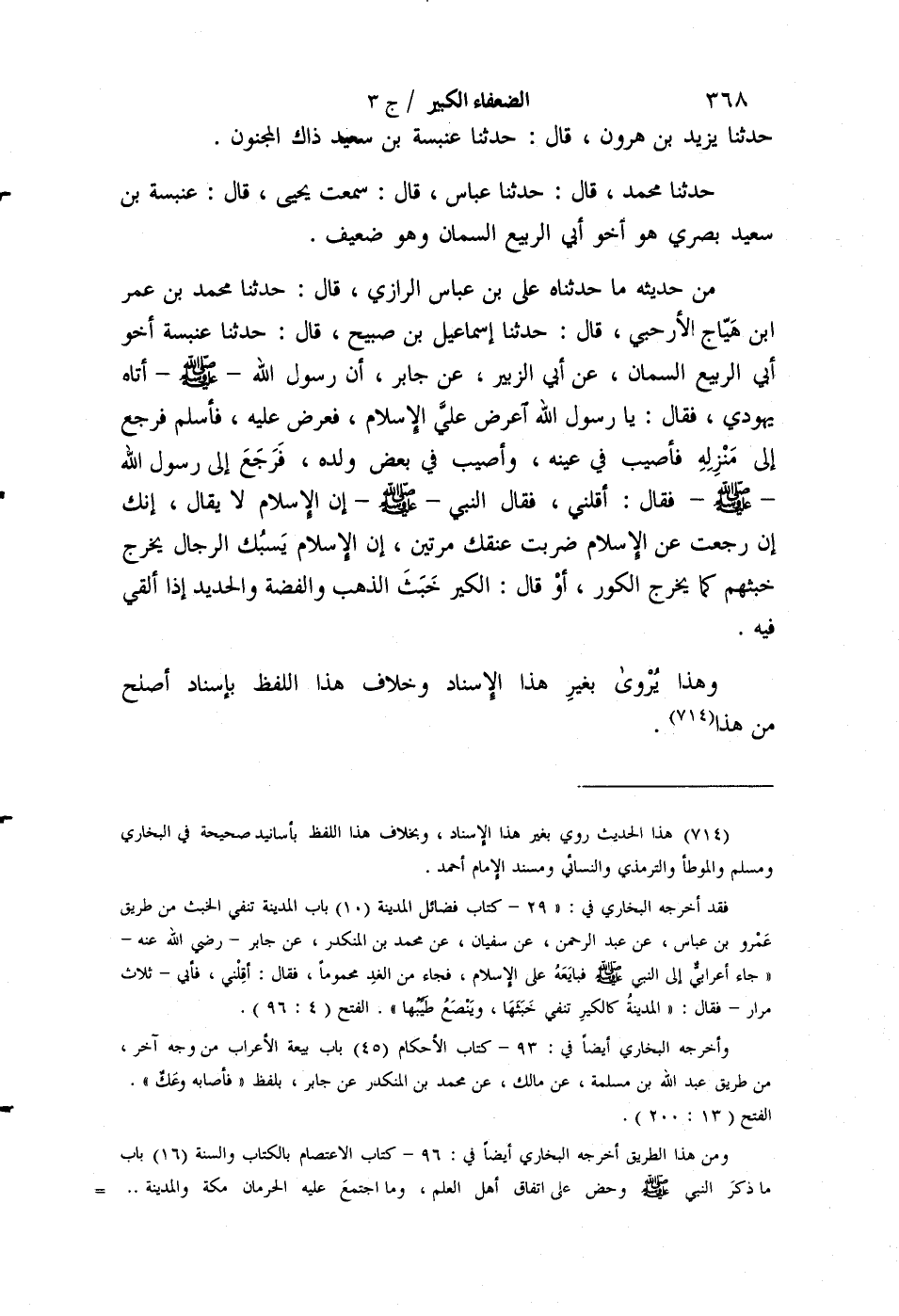 مِنْ حَدِيثِهِ: مَا حَدَّثَنَاهُ عَلِيُّ بْنُ عَبَّاسٍ الرَّازِيُّ قَالَ: حَدَّثَنَا مُحَمَّدُ بْنُ عُمَرَ بْنِ هَيَّاجٍ الْأَرْحَبِيُّ قَالَ: حَدَّثَنَا إِسْمَاعِيلُ بْنُ صُبَيْحٍ قَالَ: حَدَّثَنَا عَنْبَسَةُ، أَخُو أَبِي الرَّبِيعِ السَّمَّانِ، عَنْ أَبِي الزُّبَيْرِ، عَنْ جَابِرٍ: " أَنَّ رَسُولَ اللَّهِ صَلَّى اللهُ عَلَيْهِ وَسَلَّمَ أَتَاهُ يَهُودِيٌّ فَقَالَ: يَا رَسُولَ اللَّهِ، اعْرِضْ عَلَيَّ الْإِسْلَامَ، فَعَرَضَ عَلَيْهِ فَأَسْلَمَ فَرَجَعَ إِلَى مَنْزِلِهِ فَأُصِيبَ فِي عَيْنِهِ وَأُصِيبَ فِي بَعْضِ وَلَدِهِ فَرَجَعَ إِلَى رَسُولِ اللَّهِ صَلَّى اللهُ عَلَيْهِ وَسَلَّمَ فَقَالَ: أَقِلْنِي، فَقَالَ النَّبِيُّ صَلَّى اللهُ عَلَيْهِ وَسَلَّمَ: " §إِنَّ الْإِسْلَامَ لَا يُقَالُ، إِنَّكَ إِنْ رَجَعْتَ عَنِ الْإِسْلَامِ ضَرَبْتُ عُنُقَكَ مَرَّتَيْنِ، إِنَّ الْإِسْلَامَ يَسْبُكُ الرِّجَالَ يُخْرِجُ خَبَثَهُمْ كَمَا يُخْرِجُ الْكُورُ، أَوْ قَالَ: الْكِيرُ، خَبَثَ الذَّهَبِ وَالْفِضَّةِ وَالْحَدِيدِ إِذَا أُلْقِيَ فِيهِ " وَهَذَا يُرْوَى بِغَيْرِ هَذَا الْإِسْنَادِ وَخِلَافِ هَذَا اللَّفْظِ بِإِسْنَادٍ أَصْلَحَ مِنْ هَذَا