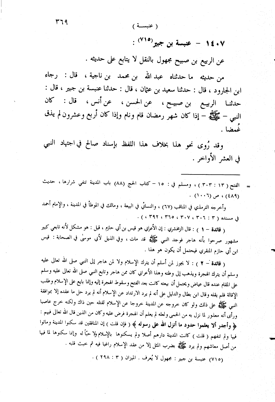 §1407 - عَنْبَسَةُ بْنُ جُبَيْرٍ عَنِ الرَّبِيعِ بْنِ صَبِيحٍ، مَجْهُولٌ بِالنَّقْلِ، لَا يُتَابَعُ عَلَى حَدِيثِهِ