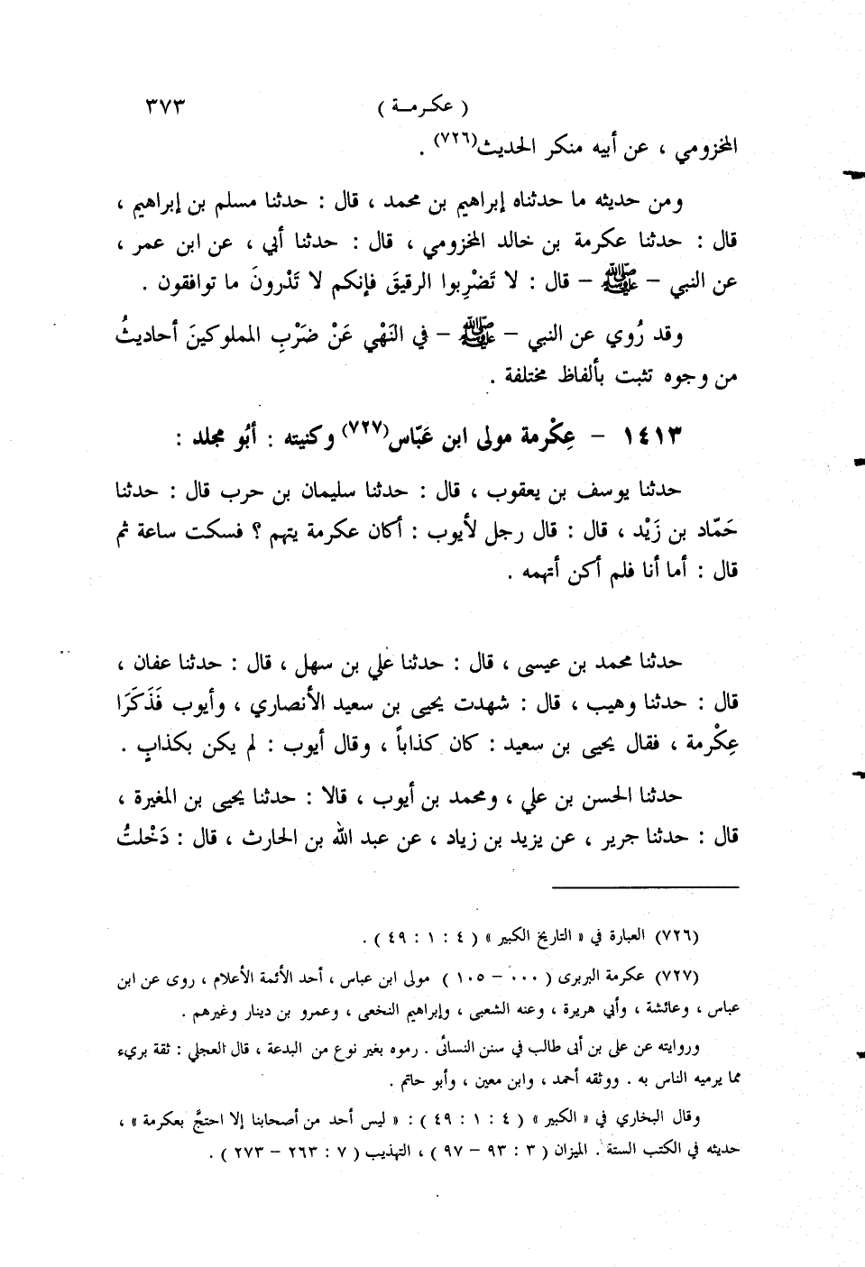 §1413 - عِكْرِمَةُ مَوْلَى ابْنِ عَبَّاسٍ وَكُنْيَتُهُ أَبُو مَجْلَدٍ حَدَّثَنَا يُوسُفُ بْنُ يَعْقُوبَ قَالَ: حَدَّثَنَا سُلَيْمَانُ بْنُ حَرْبٍ قَالَ: حَدَّثَنَا حَمَّادُ بْنُ زَيْدٍ قَالَ: قَالَ رَجُلٌ لِأَيُّوبَ: أَكَانَ عِكْرِمَةُ يُتَّهَمُ؟ فَسَكَتَ سَاعَةً ثُمَّ قَالَ: أَمَّا أَنَا فَلَمْ أَكُنْ أَتَّهِمُهُ. حَدَّثَنَا مُحَمَّدُ بْنُ عِيسَى قَالَ: حَدَّثَنَا عَلِيُّ بْنُ سَهْلٍ قَالَ: حَدَّثَنَا عَفَّانُ قَالَ: حَدَّثَنَا وُهَيْبٌ قَالَ: شَهِدْتُ يَحْيَى بْنَ سَعِيدٍ الْأَنْصَارِيَّ وَأَيُّوبَ فَذَكَرَا عِكْرِمَةَ فَقَالَ يَحْيَى بْنُ سَعِيدٍ: كَانَ كَذَّابًا، وَقَالَ أَيُّوبُ: لَمْ يَكُنْ بِكَذَّابٍ. حَدَّثَنَا الْحَسَنُ بْنُ عَلِيٍّ، وَمُحَمَّدُ بْنُ أَيُّوبَ، قَالَا: حَدَّثَنَا يَحْيَى بْنُ الْمُغِيرَةِ قَالَ: حَدَّثَنَا جَرِيرٌ، عَنْ يَزِيدَ بْنِ زِيَادٍ، عَنْ عَبْدِ اللَّهِ بْنِ الْحَارِثِ قَالَ: دَخَلْتُ -[374]- عَلَى عَلِيِّ بْنِ عَبْدِ اللَّهِ بْنِ عَبَّاسٍ فَإِذَا عِكْرِمَةُ فِي وَثَاقٍ عِنْدَ بَابِ الْحَسَنِ فَقُلْتُ لَهُ: أَلَا تَتَّقِي اللَّهَ، قَالَ: فَإِنَّ هَذَا الْخَبِيثَ يَكْذِبُ عَلَى أَبِي. حَدَّثَنَا رَوْحُ بْنُ الْفَرَحِ أَبُو الزِّنْبَاعِ قَالَ: حَدَّثَنَا عَمْرُو بْنُ خَلَفٍ قَالَ: حَدَّثَنَا ابْنُ لَهِيعَةَ، عَنْ هِشَامِ بْنِ سَعْدٍ، عَنْ عَطَاءٍ الْخُرَاسَانِيِّ، أَنَّهُ قَالَ لِسَعِيدِ بْنِ الْمُسَيِّبِ: إِنَّ عِكْرِمَةَ يَقُولُ: إِنَّ رَسُولَ اللَّهِ صَلَّى اللهُ عَلَيْهِ وَسَلَّمَ تَزَوَّجَ وَهُوَ مُحْرِمٌ، فَقَالَ: كَذَبَ مَخْبَثَانٌ. حَدَّثَنَا أَحْمَدُ بْنُ مُحَمَّدِ بْنِ عَاصِمٍ قَالَ: حَدَّثَنَا أَبُو عُبَيْدَةَ أَحْمَدُ بْنُ عَبْدِ اللَّهِ بْنِ مُحَمَّدِ بْنِ عَبْدِ اللَّهِ بْنِ سَعِيدٍ أَبُو السَّفَرِ قَالَ: حَدَّثَنِي سَعِيدُ بْنُ عَامِرٍ قَالَ: حَدَّثَنَا شُعْبَةُ، عَنْ عَمْرِو بْنِ مُرَّةَ قَالَ: سَأَلْتُ سَعِيدَ بْنَ الْمُسَيِّبِ عَنْ تَفْسِيرِ، آيَةٍ مِنْ كِتَابِ اللَّهِ فَقَالَ: مَا أَنَا بِجَرِيءٌ عَلَيْهِ، وَلَكِنْ دُونَكَ مَنْ يَزْعُمُ أَنَّهُ لَا يَخْفَى عَلَيْهِ مِنْهُ حَرْفٌ، يُعَرِّضُ بِعِكْرِمَةَ. حَدَّثَنَا إِبْرَاهِيمُ بْنُ يُوسُفَ قَالَ: حَدَّثَنَا عَبْدُ الرَّحْمَنِ بْنُ عَبْدِ اللَّهِ بْنِ عَبْدِ الْحَكَمِ قَالَ: حَدَّثَنَا الْخَصِيبُ بْنُ نَاصِحٍ قَالَ: حَدَّثَنَا خَالِدُ بْنُ خِدَاشٍ قَالَ: شَهِدْتُ حَمَّادَ بْنَ زَيْدٍ فِي آخِرِ يَوْمٍ مَاتَ فِيهِ فَقَالَ: أُحَدِّثُكُمْ بِحَدِيثٍ لَمْ أُحَدِّثْ بِهِ قَطُّ، وَقَالَ: مَا أُحَدِّثُكُمْ بِهِ إِلَّا أَكْرَهُ أَنْ أَلْقَى اللَّهَ وَلَمْ أُحَدِّثْ بِهِ، سَمِعْتُ أَيُّوبَ يُحَدِّثُ عَنْ عِكْرِمَةَ قَالَ: إِنَّمَا أَنْزَلَ اللَّهُ مُتَشَابِهَ الْقُرْآنِ لِيُضِلَّ بِهِ. وَمِمَّنْ مَدَحَ عِكْرِمَةَ رَضِيَ اللَّهُ عَنْهُ وَأَثْنَى عَلَيْهِ. حَدَّثَنَا عَبْدُ اللَّهِ بْنُ أَحْمَدَ النَّيْسَابُورِيُّ سَنْبَرٌ قَالَ: حَدَّثَنَا يَحْيَى بْنُ يَحْيَى قَالَ: حَدَّثَنَا إِسْمَاعِيلُ، عَنْ أَيُّوبَ، عَنْ عَمْرِو بْنِ دِينَارٍ قَالَ: رَفَعَ إِلَيَّ جَابِرُ بْنُ زَيْدٍ مَسَائِلَ سُئِلَ عَنْهَا عِكْرِمَةُ فَجَعَلَ جَابِرُ بْنُ زَيْدٍ يَقُولُ: هَذَا مَوْلَى ابْنِ عَبَّاسٍ، هَذَا الْبَحْرُ فَاسْأَلُوهُ. حَدَّثَنَا مُحَمَّدُ بْنُ جَعْفَرِ بْنِ مُحَمَّدِ بْنِ أَعْيَنَ قَالَ: حَدَّثَنَا إِسْحَاقُ بْنُ -[375]- إِسْمَاعِيلَ، ح وَحَدَّثَنَا مُحَمَّدُ بْنُ عِيسَى قَالَ: إِبْرَاهِيمُ بْنُ سَعْدٍ قَالَا: حَدَّثَنَا سُفْيَانُ، عَنْ عَمْرٍو قَالَ: أَعْطَانِي جَابِرُ بْنُ زَيْدٍ صَحِيفَةً فِيهَا مَسَائِلُ فَقَالَ: سَلْ عَنْهَا عِكْرِمَةَ، فَجَعَلْتُ كَأَنِّي أَتَبَطَّأُ فَانْتَزَعَهَا مِنْ يَدَيَّ