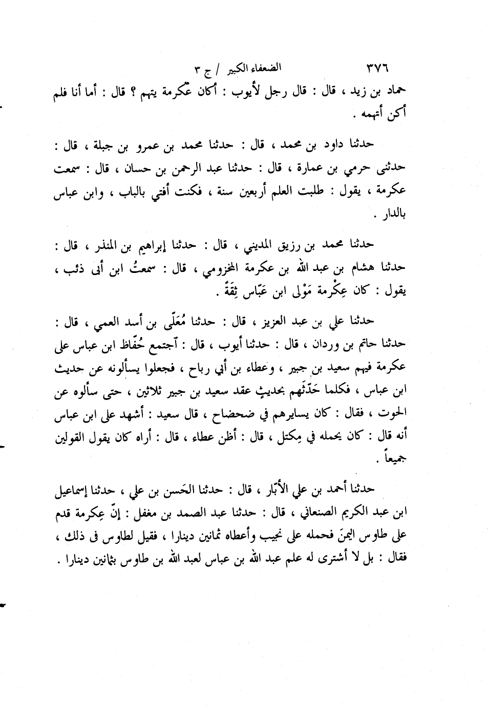 حَدَّثَنَا دَاوُدُ بْنُ مُحَمَّدٍ قَالَ: حَدَّثَنَا مُحَمَّدُ بْنُ عَمْرِو بْنِ جَبَلَةَ قَالَ: حَدَّثَنِي حَرَمِيُّ بْنُ عُمَارَةَ قَالَ: حَدَّثَنَا عَبْدُ الرَّحْمَنِ بْنُ حَسَّانَ قَالَ: سَمِعْتُ عِكْرِمَةَ، يَقُولُ: §«طَلَبْتُ الْعِلْمَ أَرْبَعِينَ سَنَةً فَكُنْتُ أُفْتِي بِالْبَابِ وَابْنُ عَبَّاسٍ بِالدَّارِ» حَدَّثَنَا مُحَمَّدُ بْنُ زُرَيْقٍ الْمَدِينِيُّ قَالَ: حَدَّثَنَا إِبْرَاهِيمُ بْنُ الْمُنْذِرِ قَالَ: حَدَّثَنَا هِشَامُ بْنُ عَبْدِ اللَّهِ بْنِ عِكْرِمَةَ الْمَخْزُومِيُّ قَالَ: سَمِعْتُ ابْنَ أَبِي ذِئْبٍ يَقُولُ: كَانَ عِكْرِمَةُ مَوْلَى ابْنِ عَبَّاسٍ ثِقَةً حَدَّثَنَا عَلِيُّ بْنُ عَبْدِ الْعَزِيزِ قَالَ: حَدَّثَنَا مُعَلَّى بْنُ أَسَدٍ الْعَمِّيُّ قَالَ: حَدَّثَنَا حَاتِمُ بْنُ وَرْدَانَ قَالَ: حَدَّثَنَا أَيُّوبُ قَالَ: اجْتَمَعَ حُفَّاظُ ابْنِ عَبَّاسٍ عَلَى عِكْرِمَةَ فِيهِمْ: سَعِيدُ بْنُ جُبَيْرٍ وَعَطَاءُ بْنُ أَبِي رَبَاحٍ، فَجَعَلُوا يَسْأَلُونَهُ عَنْ حَدِيثِ ابْنِ عَبَّاسٍ، فَكُلَّمَا حَدَّثَهُمْ بِحَدِيثٍ، عَقَدَ سَعِيدُ بْنُ جُبَيْرٍ ثَلَاثِينَ، حَتَّى سَأَلُوهُ عَنِ الْحُوتِ، فَقَالَ: كَانَ يُسَايِرُهُمْ فِي ضَحْضَاحٍ، قَالَ سَعِيدٌ: أَشْهَدُ عَلَى ابْنُ عَبَّاسٍ أَنَّهَ قَالَ: كَانَ يَحْمِلُهُ فِي مِكْتَلٍ، قَالَ: أَظُنُّ عَطَاءً قَالَ: أُرَاهُ كَانَ يَقُولُ الْقَوْلَيْنِ جَمِيعًا حَدَّثَنَا أَحْمَدُ بْنُ عَلِيٍّ الْأَبَّارُ قَالَ: حَدَّثَنَا الْحَسَنُ بْنُ عَلِيٍّ، حَدَّثَنَا إِسْمَاعِيلُ بْنُ عَبْدِ الْكَرِيمِ الصَّنْعَانِيُّ قَالَ: حَدَّثَنَا عَبْدُ الصَّمَدِ بْنُ مُغَفَّلٍ: إِنَّ عِكْرِمَةَ قَدِمَ عَلَى طَاوُسٍ الْيَمَنَ فَحَمَلَهُ عَلَى نِجِيبٍ وَأَعْطَاهُ ثَمَانِينَ دِينَارًا، فَقِيلَ لِطَاوُسٍ فِي ذَلِكَ فَقَالَ: بَلْ لَا أَشْتَرِي لَهُ عِلْمَ عَبْدِ اللَّهِ بْنِ عَبَّاسٍ لِعَبْدِ اللَّهِ بْنِ طَاوُسٍ بِثَمَانِينَ دِينَارًا