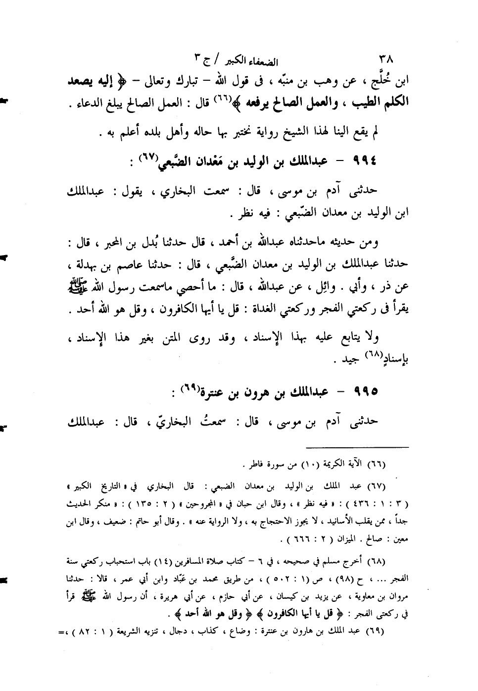 §994 - عَبْدُ الْمَلِكِ بْنُ الْوَلِيدِ بْنِ مَعْدَانَ الضُّبَعِيُّ حَدَّثَنِي آدَمُ بْنُ مُوسَى قَالَ: سَمِعْتُ الْبُخَارِيَّ يَقُولُ: عَبْدُ الْمَلِكِ بْنُ الْوَلِيدِ بْنِ مَعْدَانَ الضُّبَعِيُّ فِيهِ نَظَرٌ