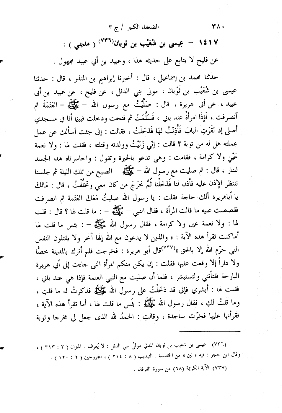 حَدَّثَنَا مُحَمَّدُ بْنُ إِسْمَاعِيلَ قَالَ: أَخْبَرَنَا إِبْرَاهِيمُ بْنُ الْمُنْذِرِ قَالَ: حَدَّثَنَا عِيسَى بْنُ شُعَيْبِ بْنِ ثَوْبَانَ، مَوْلَى بَنِي الدُّئِلِ عَنْ فُلَيْحٍ، عَنْ عُبَيْدِ بْنِ أَبِي عُبَيْدٍ، عَنْ أَبِي هُرَيْرَةَ قَالَ: " صَلَّيْتُ مَعَ رَسُولِ اللَّهِ صَلَّى اللهُ عَلَيْهِ وَسَلَّمَ الْعَتَمَةَ ثُمَّ انْصَرَفْتُ فَإِذَا امْرَأَةٌ عِنْدَ بَابِي، فَسَلَّمْتُ ثُمَّ فَتَحْتُ وَدَخَلْتُ، فَبَيْنَمَا أَنَا فِي مَسْجِدِي أُصَلِّي إِذْ نَقَرَتِ الْبَابَ فَأَذِنْتُ لَهَا فَدَخَلَتْ فَقَالَتْ: إِنِّي جِئْتُ أَسْأَلُكَ عَنْ عَمَلٍ عَمِلْتُهُ هَلْ لَهُ مِنْ تَوْبَةٍ؟ قَالَتْ: إِنِّي زَنَيْتُ وَوَلَدْتُهُ وَقَتَلْتُهُ، فَقُلْتُ لَهَا: وَلَا نِعْمَةَ عَيْنٍ، وَلَا كَرَامَةَ، فَقَامَتْ وَهِيَ تَدْعُو بِالْحَيْرَةِ وَتَقُولُ: وَاحَسْرَتَاهُ، هَذَا الْجَسَدُ لِلنَّارِ، قَالَ: ثُمَّ صَلَّيْتُ مَعَ رَسُولِ اللَّهِ صَلَّى اللهُ عَلَيْهِ وَسَلَّمَ الصُّبْحَ مِنْ تِلْكَ اللَّيْلَةِ ثُمَّ جَلَسْنَا نَنْتَظِرُ الْإِذْنَ عَلَيْهِ، فَأَذِنَ لَنَا، فَدَخَلْنَا، ثُمَّ خَرَجَ مَنْ كَانَ مَعِي وَتَخَلَّفْتُ، قَالَ: «مَا لَكَ يَا أَبَا هُرَيْرَةَ؟ أَلَكَ حَاجَةٌ؟» . فَقُلْتُ: يَا رَسُولَ اللَّهِ، صَلَّيْتُ مَعَكَ الْعَتَمَةَ ثُمَّ انْصَرَفْتُ، فَقَصَصْتُ عَلَيْهِ مَا قَالَتِ الْمَرْأَةُ، فَقَالَ النَّبِيُّ صَلَّى اللهُ عَلَيْهِ وَسَلَّمَ: «مَا قُلْتَ لَهَا؟» . قَالَ: قُلْتُ لَهَا: وَلَا نِعْمَةَ عَيْنٍ وَلَا كَرَامَةَ، فَقَالَ رَسُولُ اللَّهِ صَلَّى اللهُ عَلَيْهِ وَسَلَّمَ: " §بِئْسَ مَا قُلْتَ لَهَا، أَمَا كُنْتَ تَقْرَأُ هَذِهِ الْآيَةَ: {وَالَّذِينَ لَا يَدْعُونَ مَعَ اللَّهِ إِلَهًا آخَرَ وَلَا يَقْتُلُونَ النَّفْسَ الَّتِي حَرَّمَ اللَّهُ إِلَّا بِالْحَقِّ} [الفرقان: 68] ". قَالَ أَبُو هُرَيْرَةَ: فَخَرَجْتُ فَلَمْ أَتْرُكْ بِالْمَدِينَةِ خُصًّا وَلَا دَارًا إِلَّا وَقَعْتُ عَلَيْهَا فَقُلْتُ: إِنْ يَكُنْ مِنْكُمُ الْمَرْأَةُ الَّتِي جَاءَتْ إِلَى أَبِي هُرَيْرَةَ الْبَارِحَةَ فَلْتَأْتِنِي وَلْتَسْتَبْشِرْ، فَلَمَّا أَنْ صَلَّيْتُ مَعَ النَّبِيِّ صَلَّى اللهُ عَلَيْهِ وَسَلَّمَ الْعَتَمَةَ فَإِذَا هِيَ عِنْدَ بَابِي، فَقُلْتُ لَهَا: أَبْشِرِي، فَإِنِّي قَدْ دَخَلْتُ عَلَى رَسُولِ اللَّهِ صَلَّى اللهُ عَلَيْهِ وَسَلَّمَ فَذَكَرْتُ لَهُ مَا قُلْتِ وَمَا قُلْتُ لَكِ، فَقَالَ رَسُولُ اللَّهِ صَلَّى اللهُ عَلَيْهِ وَسَلَّمَ: " بِئْسَ مَا قُلْتَ لَهَا، أَمَا تَقْرَأُ هَذِهِ الْآيَةَ، فَقَرَأْتُهَا عَلَيْهَا، فَخَرَّتْ سَاجِدَةً وَقَالَتِ: الْحَمْدُ لِلَّهِ الَّذِي جَعَلَ لِي مَخْرَجًا وَتَوْبَةً مِمَّا عَمِلْتُ، إِنَّ هَذِهِ الْجَارِيَةَ وَابْنَهَا حُرَّانِ لِوَجْهِ اللَّهِ، وَإِنِّي قَدْ تُبْتُ مِمَّا عَمِلْتُ "