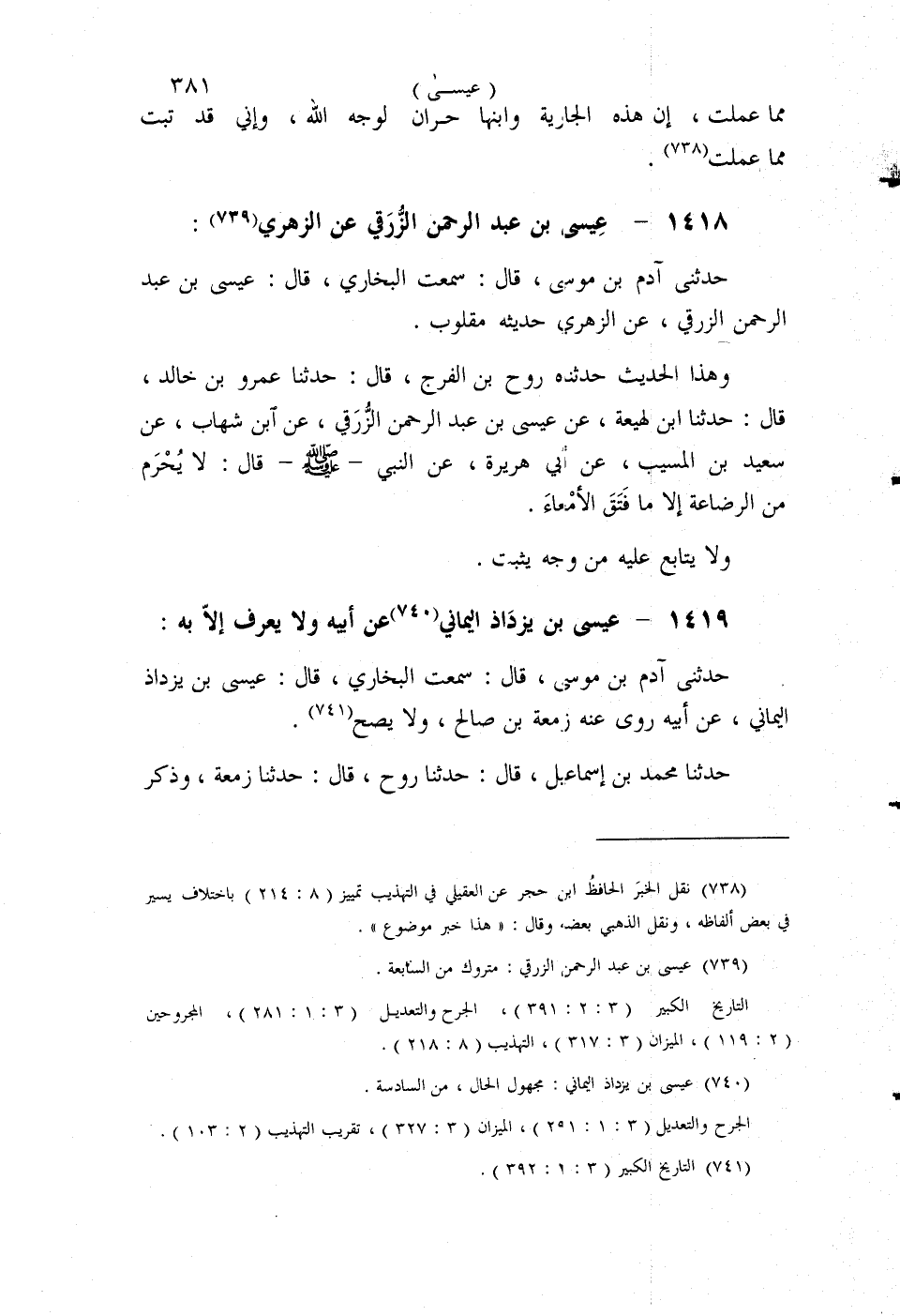§1418 - عِيسَى بْنُ عَبْدِ الرَّحْمَنِ الزُّرَقِيُّ عَنِ الزُّهْرِيِّ. حَدَّثَنِي آدَمُ بْنُ مُوسَى قَالَ: سَمِعْتُ الْبُخَارِيَّ قَالَ: عِيسَى بْنُ عَبْدِ الرَّحْمَنِ الزُّرَقِيُّ عَنِ الزُّهْرِيِّ، حَدِيثُهُ مَقْلُوبٌ