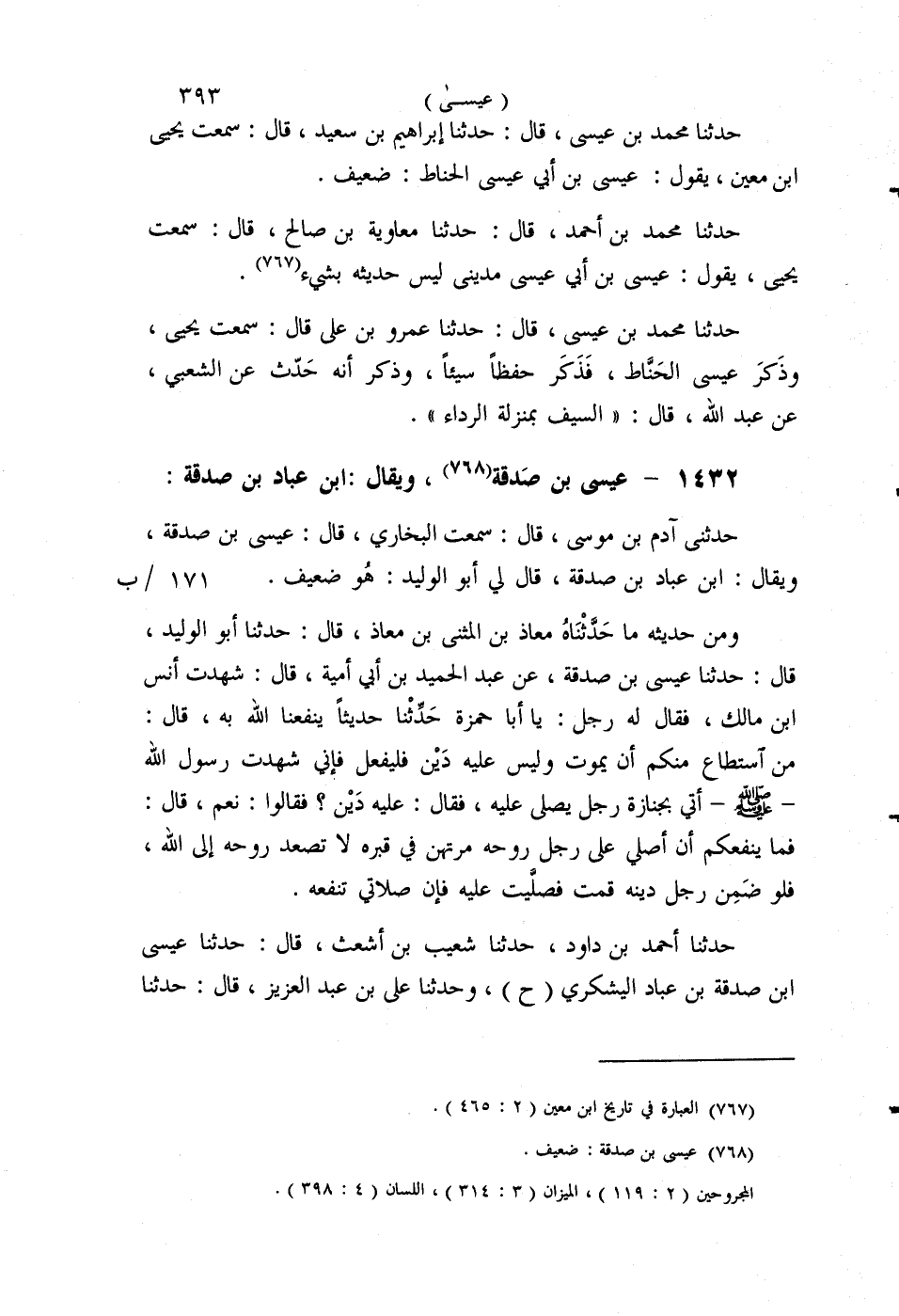 §1432 - عِيسَى بْنُ صَدَقَةَ وَيُقَالُ ابْنُ عَبَّادِ بْنِ صَدَقَةَ حَدَّثَنِي آدَمُ بْنُ مُوسَى قَالَ: سَمِعْتُ الْبُخَارِيَّ قَالَ: عِيسَى بْنُ صَدَقَةَ، وَيُقَالُ ابْنُ عَبَّادِ بْنِ صَدَقَةَ، قَالَ لِي أَبُو الْوَلِيدِ: هُوَ ضَعِيفٌ