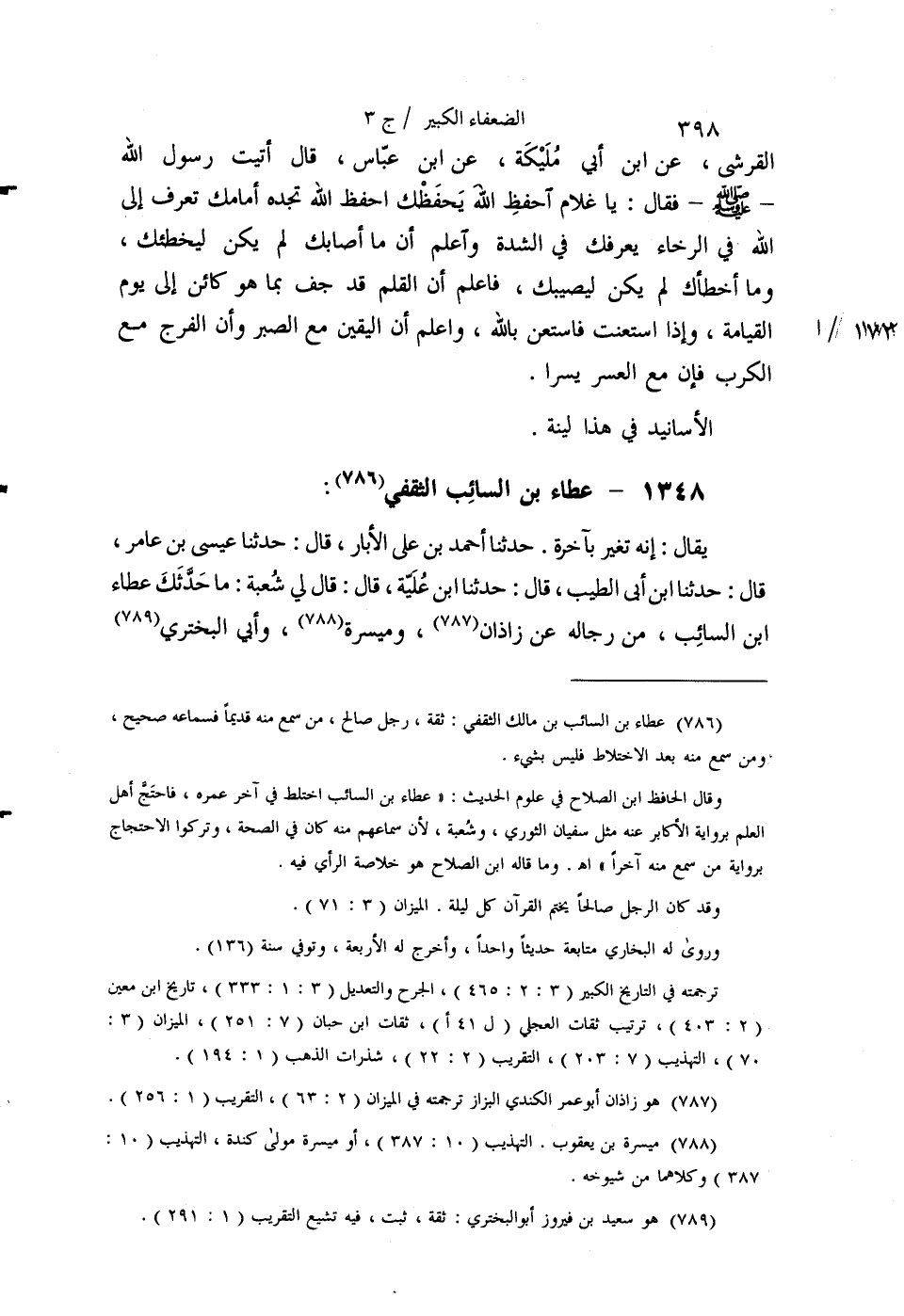 §1438 - عَطَاءُ بْنُ السَّائِبِ الثَّقَفِيُّ يُقَالُ إِنَّهُ تَغَيَّرَ بِآخِرِةٍ. حَدَّثَنَا أَحْمَدُ بْنُ عَلِيٍّ الْأَبَّارُ قَالَ: حَدَّثَنَا عِيسَى بْنُ عَامِرٍ قَالَ: حَدَّثَنَا ابْنُ أَبِي الطَّيِّبِ قَالَ: حَدَّثَنَا ابْنُ عُلَيَّةَ قَالَ: قَالَ لِي شُعْبَةُ: مَا حَدَّثَكَ عَطَاءُ بْنُ السَّائِبِ، مِنْ رِجَالِهِ عَنْ زَاذَانَ، وَمَيْسَرَةَ، وَأَبِي الْبَخْتَرِيِّ -[399]-، فَلَا تَكْتُبْهُ، وَمَا حَدَّثَكَ عَنْ رَجُلٍ، بِعَيْنِهِ فَاكْتُبْهُ. حَدَّثَنَا أَحْمَدُ بْنُ مُحَمَّدِ بْنِ بَكْرٍ قَالَ: حَدَّثَنَا شُجَاعُ بْنُ مَخْلَدٍ قَالَ: حَدَّثَنَا أَبُو قَطَنٍ قَالَ: قَالَ شُعْبَةُ: ثَلَاثٌ فِي الْقَلْبِ مِنْهُمْ هَاجِسٌ: عَطَاءُ بْنُ سَائِبٍ وَيَزِيدُ بْنُ أَبِي زِيَادٍ، وَرَجُلٌ آخَرُ. حَدَّثَنَا مُحَمَّدُ بْنُ عِيسَى قَالَ: حَدَّثَنَا عَمْرُو بْنُ عَلِيٍّ قَالَ: سَمِعْتُ يَحْيَى يَقُولُ: مَا سَمِعْتُ أَحَدًا، مِنَ النَّاسِ يَقُولُ فِي عَطَاءِ بْنِ السَّائِبِ شَيْئًا فِي حَدِيثِهِ الْقَدِيمِ. قُلْتُ لِيَحْيَى: مَا حَدَّثَ سُفْيَانُ وَشُعْبَةُ أَصَحِيحٌ هُوَ؟ قَالَ: " نَعَمْ، إِلَّا حَدِيثَيْنِ كَانَ شُعْبَةُ يَقُولُ: سَمِعْتُهُمَا بِآخِرَةٍ. حَدَّثَنَا مُحَمَّدُ بْنُ إِسْمَاعِيلَ قَالَ: حَدَّثَنَا الْحَسَنُ بْنُ عَلِيٍّ الْحُلْوَانِيُّ قَالَ: حَدَّثَنَا عَلِيُّ بْنُ الْمَدِينِيِّ قَالَ: حَدَّثَنَا ابْنُ عُلَيَّةَ قَالَ: قَدِمَ عَلَيْنَا عَطَاءُ بْنُ السَّائِبِ الْبَصْرَةَ وَكُنَّا نَسْأَلُهُ قَالَ: فَكَانَ يَتَوَهَّمُ، قَالَ: فَيَقُولُ لَهُ مَنْ؟ فَيَقُولُ: أَشْيَاخُنَا مَيْسَرَةُ، وَزَاذَانُ، وَفُلَانٌ، وَفُلَانٌ. قَالَ عَلِيٌّ: قَالَ وُهَيْبٌ: قَدِمَ عَلَيْنَا عَطَاءُ بْنُ السَّائِبِ فَقُلْتُ: كَمْ حَمَلْتَ عَنْ عُبَيْدَةَ؟ قَالَ: أَرْبَعِينَ حَدِيثًا، قَالَ عَلِيٌّ: وَلَيْسَ يَرْوِي عَنْ عُبَيْدَةَ حَرْفًا وَاحِدًا، فَقُلْتُ: فَعَلَى مَا يَحْمِلُ هَذَا؟ قَالَ: عَلَى الِاخْتِلَاطِ، إِنَّهُ اخْتَلَطَ. قَالَ عَلِيٌّ: قُلْتُ لِيَحْيَى: وَكَانَ أَبُو عَوَانَةَ حَمَلَ عَنْ عَطَاءِ بْنِ السَّائِبِ قَبْلَ أَنْ يَخْتَلِطَ؟ فَقَالَ: كَانَ لَا يَفْصِلُ هَذَا مِنْ هَذَا، وَكَذَلِكَ حَمَّادُ بْنُ سَلَمَةَ -[400]-. وَكَانَ يَحْيَى لَا يَرْوِي حَدِيثَ عَطَاءِ بْنِ السَّائِبِ إِلَّا عَنْ شُعْبَةَ وَسُفْيَانَ. قَالَ يَحْيَى: قُلْتُ لِأَبِي عَوَانَةَ، فَقَالَ: كَتَبْتُ عَنْ عَطَاءٍ قَبْلُ وَبَعْدُ فَاخْتَلَطَ عَلَيَّ. حَدَّثَنَا مُحَمَّدُ بْنُ جَعْفَرٍ قَالَ: حَدَّثَنَا أَبُو بَكْرِ بْنُ أَبِي الْأَسْوَدِ قَالَ: سَمِعْتُ إِسْمَاعِيلَ ابْنَ عُلَيَّةَ يَقُولُ: كَانَ عَطَاءُ بْنُ السَّائِبِ إِذَا سُئِلَ عَنِ الشَّيْءِ، قَالَ: كَانَ أَصْحَابُنَا يَقُولُونَ، فَيُقَالُ لَهُ: مَنْ؟ فَيَسْكُتُ سَاعَةً ثُمَّ يَقُولُ: أَبُو الْبَخْتَرِيِّ وَزَاذَانُ وَمَيْسَرَةُ قَالَ: وَكُنْتُ أَخَافُ أَنْ يَكُونَ يَجِيءُ بِهَذَا عَلَى التَّوَهُّمِ، فَلَمْ أَحْمِلْ مِنْهَا شَيْئًا. حَدَّثَنَا مُحَمَّدٌ قَالَ: حَدَّثَنَا الْحُمَيْدِيُّ قَالَ: حَدَّثَنَا سُفْيَانُ قَالَ: كُنْتُ سَمِعْتُ مِنَ، عَطَاءِ بْنِ السَّائِبِ قَدِيمًا ثُمَّ قَدِمَ عَلَيْنَا قَدْمَةً فَسَمِعْتُهُ يُحَدِّثُ، بَعْضَ مَا كُنْتُ سَمِعْتُ فَخَلَطَ، فِيهِ، فَاتَّقَيْتُهُ وَاعْتَزَلْتُهُ. حَدَّثَنَا إِبْرَاهِيمُ بْنُ مُحَمَّدٍ قَالَ: حَدَّثَنَا سُلَيْمَانُ بْنُ حَرْبٍ قَالَ: حَدَّثَنَا أَبُو النُّعْمَانِ، عَنْ يَحْيَى بْنِ سَعِيدٍ الْقَطَّانِ قَالَ: عَطَاءُ بْنُ السَّائِبِ تَغَيَّرَ حِفْظُهُ بَعْدُ، وَحَمَّادٌ، يَعْنِي ابْنَ زَيْدٍ سَمِعَ مِنْهُ، قَبْلَ أَنْ يَتَغَيَّرَ. حَدَّثَنَا عَبْدُ اللَّهِ بْنُ أَحْمَدَ قَالَ: سَأَلْتُ يَحْيَى بْنَ مَعِين
