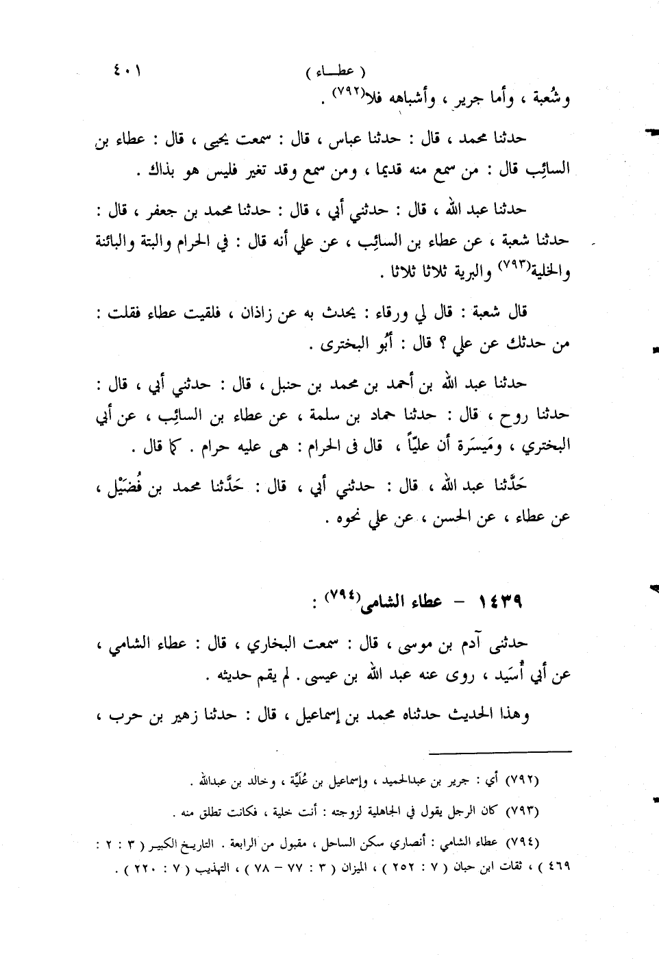§1439 - عَطَاءٌ الشَّامِيُّ حَدَّثَنِي آدَمُ بْنُ مُوسَى قَالَ: سَمِعْتُ الْبُخَارِيَّ قَالَ: عَطَاءٌ الشَّامِيُّ، عَنْ أَبِي أُسَيْدٍ، رَوَى عَنْهُ عَبْدُ اللَّهِ بْنُ عِيسَى، لَمْ يَقُمْ حَدِيثُهُ