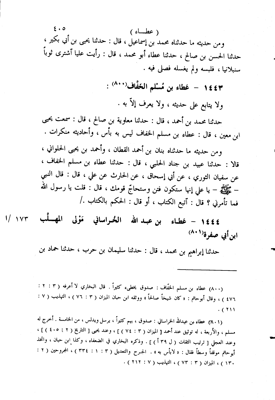 §1443 - عَطَاءُ بْنُ مُسْلِمٍ الْخَفَّافُ وَلَا يُتَابَعُ عَلَى حَدِيثِهِ، وَلَا يُعْرَفُ إِلَّا بِهِ. حَدَّثَنَا مُحَمَّدُ بْنُ أَحْمَدَ قَالَ: حَدَّثَنَا مُعَاوِيَةُ بْنُ صَالِحٍ قَالَ: سَمِعْتُ يَحْيَى بْنَ مَعِينٍ قَالَ: عَطَاءُ بْنُ مُسْلِمٍ الْخَفَّافُ لَيْسَ بِهِ بَأْسٌ، وَأَحَادِيثُهُ مُنْكَرَاتٌ